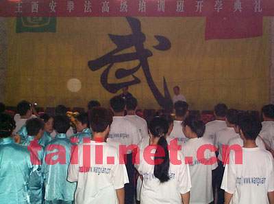 今天早上8:30,首届王西安拳法研究会陈式太极拳高级培训班开学典礼仪式在温县太极武术馆举行,来自全国各地的80余名太极拳爱好者将在这里进行为期一周的太极拳提高培训。本次培训由王西安拳法研究会主办,太极大师王西安先生亲自执教,培训内容包括:陈式太极拳老架一路和王西安先生结合自己多年经验创编的综合太极拳。