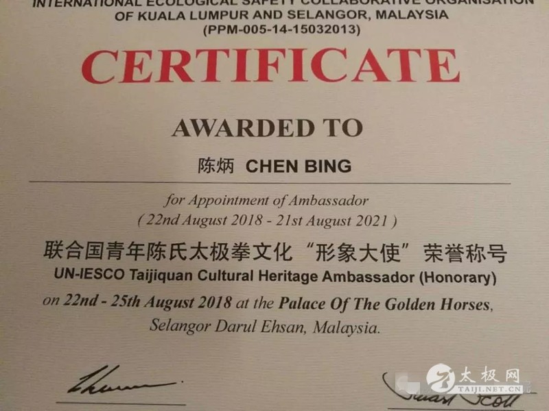 2018年8月25号,联合国生态环境保护组织举办的青年陈氏太极拳培训在马来西亚吉隆坡圆满结束,此次培训活动邀请的主讲师是来自中国陈家沟的陈炳老师。闭幕宴会上,联合国环境生态保护组织副主任Stuart Scott为嘉宾颁奖,陈炳被授予“联合国青年陈氏太极拳形象大使”。陈家沟国际太极院的陈晨、范昭朋、冉发林、陈飞、郑世诚、周浩田、史鹏辉做为此次培训的助教和嘉宾全程参与了活动。