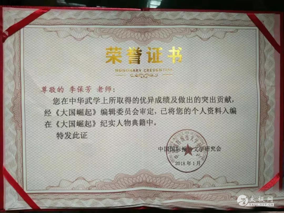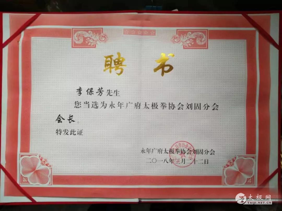 李保芳 ,男 ,汉族 ,1966年出生于杨式太极拳发源地——河北永年,自幼喜爱武术。 1971年得祖父李永清嫡传少林拳、刀、枪、剑、棍等。在1980年拜永年传统杨式太极拳第四代宗师李竹林为师。立为永年杨式太极拳五代正宗传人。1985年正式收徒,全国各地慕名而来的学员很多。 传授中华传统武术,弘扬永年杨班侯太极拳。谨尊师训,尚武重德。在2018年3月22,永年广府太极拳协会授予:“太极名师”称号。 2018年1月,经《大国崛起》编辑委员会审定,在中华武学上所取得的优异成绩及做出的突出贡献,已入编在《大国崛起》记实人物典籍中。 2016年12月在中国·杨氏太极拳创始人杨禄禅故里闫门镇首届“平安杯”太极拳交流大会比赛中荣获“杨式太极拳金奖”、“太极器械金奖”。2017年5月参加邯郸市肥乡区第三届“太极酒业杯”太极拳比赛中,荣获杨式太极拳金奖。 同年10月参加第十届永年广府太极拳年会“康养杯”国际太极拳比赛中荣获“传统杨式太极拳金奖”。2018年元月1日,在中国永年广府太极拳协会对外交流中心“粤港奥巡演交流”中荣获“太极使者突出贡献奖”。近几年来带领弟子多次参加全国比赛和国际比赛荣获金、银、铜牌数十枚。 现任永年杨班侯太极拳研究会会长,永年广府太极拳协会刘固分会会长,巨鹿县武式太极拳协会高级顾问,大运河武术联盟第一届教练委员会副主任,邯郸市武术协会太极拳专业委员会副秘书长,永年广府太极拳协会成安分会顾问,永年太极禅乡文化研究会副会长。 常年培训:永年传统杨班侯太极拳,剑,推手,散手,太极双扇,以及少林罗汉拳,佛尘,单刀,大刀等。 |