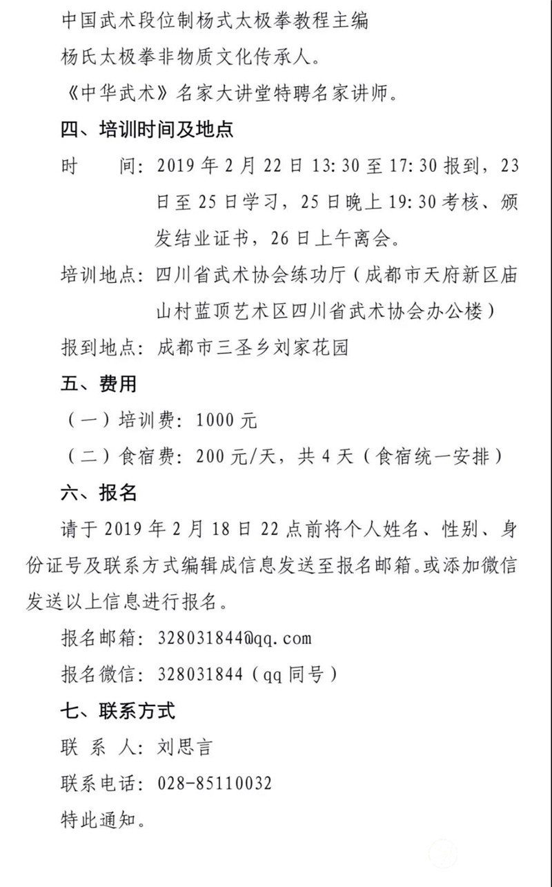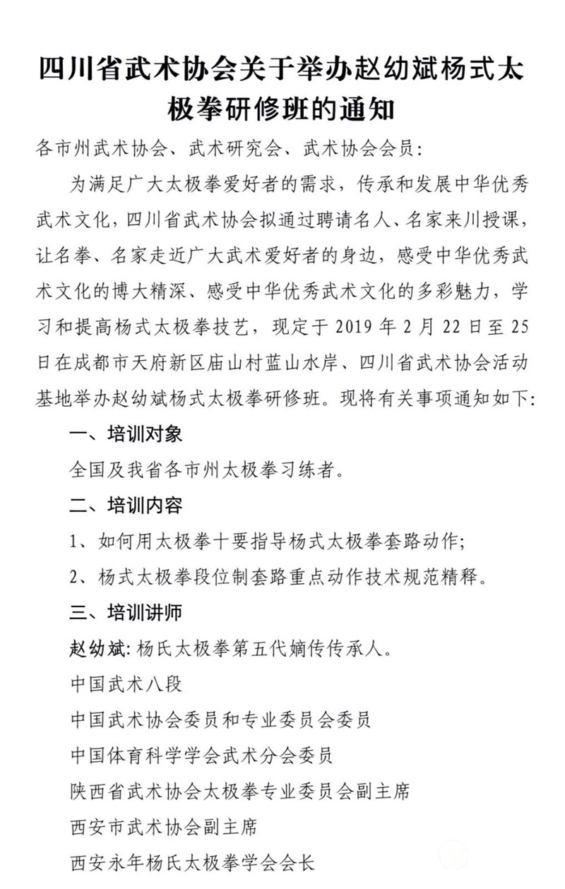 | 四川省武术协会关于举办赵幼斌杨式太极拳研修班的通知 各市州武术协会、武术研究会、武术协会会员: 为满足广大太极拳爱好者的需求,传承和发展中华优秀武术文化,四川省武术协会拟通过聘请名人、名家来川授课,让名拳、名家走近广大武术爱好者的身边,感受中华优秀武术文化的博大精深、感受中华优秀武术文化的多彩魅力,学习和提高杨式太极拳技艺,现定于2019年2月22日至25日在成都市天府新区庙山村蓝山水岸、四川省武术协会活动基地举办赵幼斌杨式太极拳研修班。现将有关事项通知如下:  一、培训对象 全国及我省各市州太极拳习练者 二、培训内容 1、如何用太极拳十要指导杨式太极拳套路动作 2、杨式太极拳段位制套路重点动作技术规范精释 三、培训讲师 赵幼斌:杨氏太极拳第五代嫡传传承人 中国武术八段 中国武术协会委员和专业委员会委员 中国体育科学学会武术分会委员 陕西省武术协会太极拳专业委员会副主席 西安市武术协会副主席 西安永年杨氏太极拳学会会长 中国武术段位制杨式太极拳教程主编 杨氏太极拳非物质文化传承人 《中华武术》名家大讲堂特聘名家讲师 四、培训时间及地点 时  间:2019年2月22日13:30至17:30报到; 23日至25日学习; 25日晚上19:30考核、颁发结业证书,26日上午离会; 培训地点:四川省武术协会练功厅(成都市天府新区庙山村蓝顶艺术区四川省武术协会办公楼) 报到地点:成都市三圣乡刘家花园 五、费用 (一)培训费: 1000元 (二)食宿费: 200元/天,共4天(食宿统一安排) 六、报名   请于2019年2月18日22点前将个人姓名、性别、身份证号及联系方式编辑成信息发送至报名邮箱。或添加微信发送以上信息进行报名。 报名邮箱: 328031844@qq. com 报名微信: 328031844 (qq同号) , 七、联系方式  联系人:刘思言 联系电话: 028-85110032 特此通知 赵幼斌老师简介 目前主要担任: 中国武术协会委员和专业委员会委员 中国体育科学学会武术分会委员 陕西省太极拳委员会副主任 陕西永年杨式太极拳推广中心主任 西安市武术协会副主席 西安太极拳总会会长 西安永年杨氏太极拳学会会长 中国武术段位制杨式太极拳教程主编之一 香港赵幼斌杨氏太极拳总会永远荣誉会长 美国国会众议院荣誉状获得者 泰国太极拳总会“终身贡献奖”获得者 邯郸学院客座教授 河南大学客座教授 赵幼斌祖籍河北永年广府镇,1950年生于杨氏太极拳世家。七岁起随父赵斌(1906-1999)习拳,赵斌是杨澄甫宗师之侄外孙,为杨氏太极拳第四代亲族传人,一代太极名宿。赵幼斌十六岁开始授拳,传拳足迹遍及国内、港澳台地区及二十多个国家,弟子、学生遍布世界各地。赵幼斌是世界太极拳网公布的太极拳十大家族中赵斌家族的掌门人。 赵幼斌先生足迹遍及我国23个省的40余个市县区及港澳台地区,历访美国、法国、德国、卢森堡、澳洲、日本、韩国、泰国、新加坡、马来西亚、印尼等国,门生弟子众多。是国内、国外著名的杨式太极拳的继承者,传播者,太极拳活动家,对太极拳事业贡献显著。 赵幼斌先生著有《杨氏太极拳真传》、《杨氏太极拳讲座》、《85式杨氏太极拳教程》、《28、37杨氏式太极拳》、《杨氏13式太极刀51式太极剑》等系列书籍和教学光碟。在《中华武术》、《武当》 、《太极》 等杂志发表《杨澄甫太极拳式歌诀释义》等数十篇太极拳专著和文章。是《中华武术》杂志“名家讲堂"栏目专题论述者。他纯正的拳术风范和深刻的理论见解,在国内外都产生了较大影响。被列入中国武术名家词典、《世界名人录》 等史册。他还应李连杰和马云的邀请为他们共同发起创办的太极禅国际文化发展有限公司创编技术套路。 2008年7月,他被国家体育总局武术管理中心、中国武术院、中国武术协会特聘为《中国武术段位制系列教程--杨式太极拳》的主要参编人员及教学演示者,担任过多期全国武术段位制指导员骨干培训班指导员、考评,及三次段位制"国考”考官,主持过十几个省的段位培训和考评工作。他还获得2012年、2013年 度武术段位制工作先进个人奖,2013年全国百名优秀考评员称号。2016年赵幼斌先生又完成了《中国武术段位制系列教程--杨式太极拳》第二版和《教师用书》的编写工作。 |