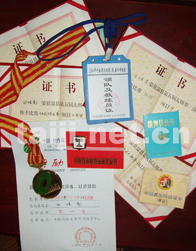 联系电话:13538061171 Tian Peiliang-A New Star of Chen"s Taijiquan Tian Peiliang ,born in Wenxian in 1975,ardently loves taijiquan since his Childhood. Alt first,he ever learhed taijiquan under the guidance of Mr.Zheng Guorui,Mr.Cui Guangbo,Mr.Zhang Dognwu and Mr.Chen Yougang,From the year 1991,he has been learning Chen"s taijiquan from Chen Jun and Chen Yingjun,the sons of great marter Chen Xiaowang.Recommended by Chen Jun and Chen Yingjun,Tian Peiliang has the honor to receiving great Marter Chen Xiaowang"s teadhiny in spear art,pushhand and the technique of Qinna.He has ever won first.class award in Chen"s taijiquan rowtine competifion and sword routine competifion for 3 times,also push- hand competifion charwpionship for 3 times,in the year 2002,has won the gold medal in puzhhand in the int"/taijiquan annual meeting.