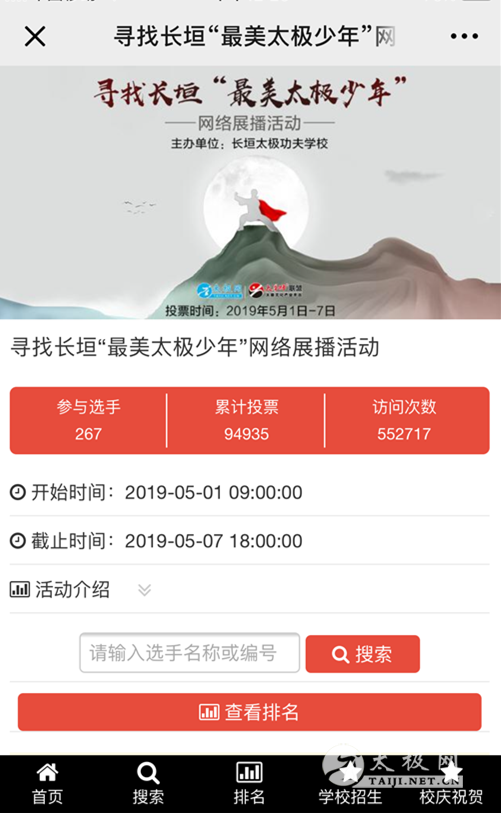 为弘扬国粹太极拳传统文化,推动全民健身,活跃长垣青少年精神文化生活,进一步推动长垣的体育文化发展,长垣太极功夫学校立足“勇担复兴大任,争当时代新人”实践活动,切实当好中华优秀传统文化的忠实守护者和使者。 在长垣太极功夫学校十周年庆典之际,特举办系列太极传播活动。线上为寻找长垣“最美太极少年”网络展播活动,线下还将举办学校十周年庆典和青少年太极拳邀请赛等。 寻找长垣“最美太极少年”网络展播活动是由长垣太极功夫学校主办,由太极网为其搭建网络展播平台,进行选手展播互动和大众评选。展播活动旨在寻找出一批优秀的太极少年,为长垣太极的发展蓄力,也将通过网络平台把太极带入人们的生活视野,让更多的人关注太极,了解太极。 本次展播活动时间为5月1日至5月7日,参赛选手共计267名长垣少年。截至发稿时,展播平台累计投票已达94512次,累计访问量已突破55万次。互动留言频繁刷屏。 本次展播活动点燃了长垣人的太极情怀。在展播平台上,人们不仅为支持的小选手们投票助力,也纷纷为他们加油助威。“少年强,则国强”是这些优秀太极少年所展现出的精神面貌映射在人们心中而不禁涌现出的自豪感慨。 长垣太极功夫学校在校长王胜伟的带领下,风雨十年,成功地把太极拳向当地青少年进行推广,从娃娃培养起,成绩斐然,得到了社会各界的一致认可,为当地太极文化的传播推广和青少年传统文化的教育事业做出了突出贡献。预祝本次展播活动圆满成功! 据本次展播活动截止时间还剩1天,网络投票活动仍在火热进行中,长垣“最美太极少年”将花落谁家?敬请持续关注太极网后续报道! 本站责编/瑞瑞 |
