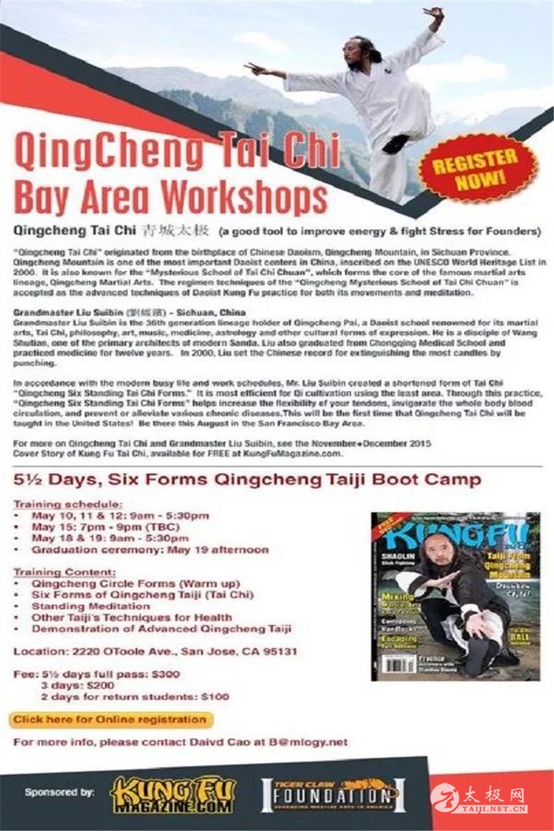 青城太极——站六养生功英文培训班5天集训,5月10号和5月18号两个周末,四川省武术文化研究会会长刘绥滨先生受硅谷中医研习社和硅谷企业家社区的邀请到硅谷传播青城太极。 青城太极功站功六式,目前这套功法就是专门为办公一族这类人群量身订做,通过近2000年青城山道家养生文化和青城太极拳功中提炼而成,适用于没有任何武术基础、没有太多锻练时间的人群习练,可不限时间,仅在方园之地就可练习。 练习之前,先将颈、肩、肘、腕、腰、胯、膝、踝关节通过正反的缓慢运动各七次,调理呼吸后,开始练习本功。本功法练完1次2分钟,建议每天坚持5-10次,即10-20分钟。加上各关节运动10分钟,1天总计运动20-30分钟,一次不能完成,无碍,一天之内分两至三次完成均可。坚持习练,3天之内必有良效。 长期坚持,肩周炎、颈椎病、手足发冷者有特效,快速培补元气,身体素质得到提高,精气神充足了,真气存内,邪不可干。疾病和亚健康自然会逐步远离你的身体。因为此套路对肩周炎颈椎病有辅助疗效,所以会出现抬肘,抬肩,抬头等动作,与传统太极有一定区别。 青城太极养生功站功六式是针对办公室一族而设计的有氧代谢运动,是中国道家休闲养生功夫系列的首套功法,对肩周炎、颈椎病及手足发冷等病症有特效。由青城山道家养生文化和青城太极拳功提炼而来,适合没有任何武术基础、没有太多锻练时间的人群习练。 刘绥滨老师:中华太极人物三十人、传统武术十大领军人物、连续六届受聘为中华养生健康国际论坛形象大使。自幼师从十余高道大德、名家隐士习武修道统,曾获中国电视吉尼斯擂主及国际、世界武术比赛冠亚军。2001年,被余国雄宗师(中国武术协会唯一认定青城派代表人物)授权成为青城派武术第36代掌门人,毕业于重庆医科大学,从医12年;授武30年;先后创立了《中国道家休闲养生功》和《太极智慧》系统课程。 曾执教全球多家高校及高端培训机构,弟子、学生遍及全球80余个国家,入选2017年传统武术推广年度十杰。多次应邀率弟子参加国内外大型活动,为各国政要、影视歌星、文化名人、企业家作武术、太极展示及养生教学;出版书籍、光盘十五套。曾任中国国际太极·瑜伽大会太极导师;中印国际瑜伽节、中国慢病管理大会、太极文化与健身气功国际论坛主讲嘉宾。 现为四川省道教协会常务理事、四川省旅游学校巴蜀武术养生学院院长、四川省武术文化研究会会长、中国武术青龙七段、中华中医药学会养生康复分会委员、中国中医药研究促进会中医全科与养生分会常委、兼任邯郸学院、西安体育学院武术系、中国人民大学健康管理学院、美国国际医药大学、美国高校太极联盟客座教授,出任北京体育大学《中国太极拳标准教学及养生康复功用研究》课题组研究员、国家科技部十二五科技支撑计划国家重点课题《中医预防保健(治未病)规范与技术标准制定》课题组特聘专家。载入《中华武术展现工程》、《中华武藏》、《中国太极拳大百科》;全球600余家媒体近30万次报道。 本站责编:太极网萌 |