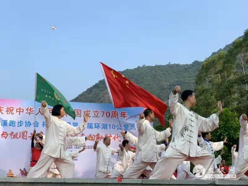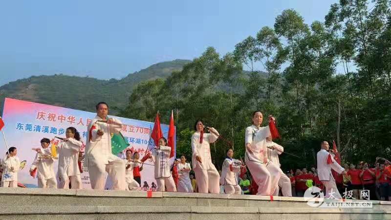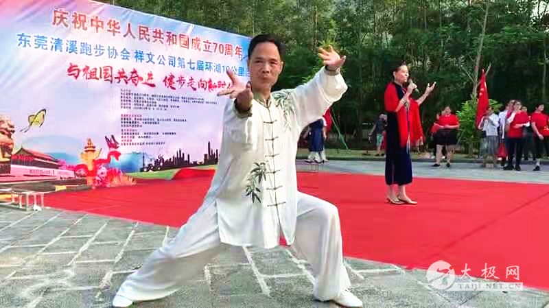 为庆祝中华人民共和国成立70周年,10月1日,东莞市清溪跑步协会联合祥文公司组织开展主题为“与祖国共奋进,健步走向新时代”的第七届环湖10公里活动。本次活动吸引了近800人参加,路线为从沿祥文公司出发,途经清溪湖环湖绿道、银瓶山游客服务中心,其中银瓶山服务中心为休息补给站。活动现场人们挥舞着手中的五星红旗,带着热情洋溢的微笑前进。 东莞武术协会清溪博圆太极馆的学员在领队、教练黄裔生的带领下参加了本次活动,展演了集体24式简化太极拳、集体武当太极剑、 集体太极功夫扇、陈式太极拳73式、56式、63式武当太极剑等套路,展示了协会队员的风采,展现了太极拳的神韵与魅力,得到了现场观众的赞赏与认可。 黄裔生(白衣) 黄裔生拳照 黄裔生