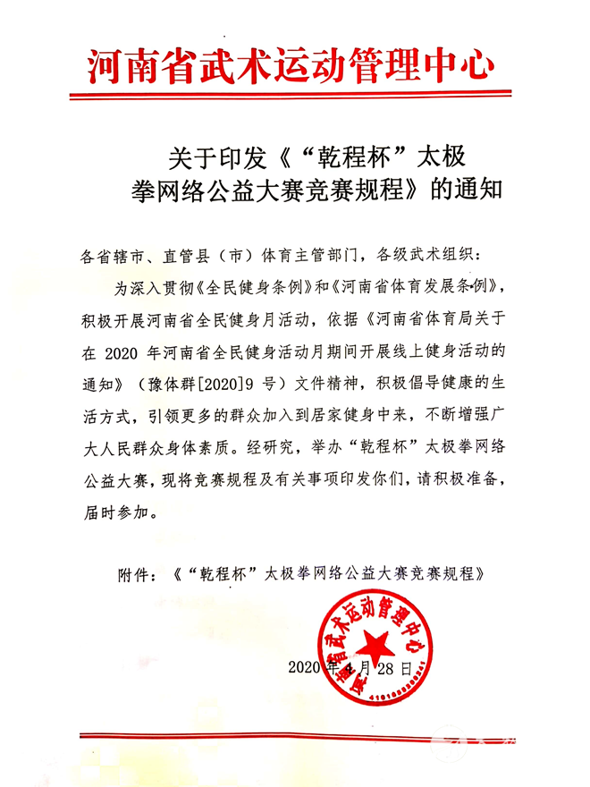 “乾程杯”太极拳网络公益大赛 竞赛规程 一、活动组织 主办:河南省武术运动管理中心 承办:河南大学武术学院 中和乾程科技发展有限公司 协办:《中华武术》杂志 中国体育教育从业培训中心太极拳工作委员会 二、活动主题 “全民健身、健康中原”,“线上健身、居家抗疫”。 三、活动时间 1.报名时间:2020 年 5月1日-5 月31日 2.专家预评:2020 年6 月1日-6月 10日 3.网络评选:2020 年 6月11日-6月20日 4.专家终评:2020 年 6月21日-6月30日 5.成绩公布:7月上旬 四、竞赛项目 (一)个人项目 1.规定项目 (1)陈式太极拳、杨式太极拳、吴式太极拳、武式太极拳、孙式太极拳的竞赛套路。 (2)陈式太极拳、杨式太极拳、吴式太极拳、武式太极拳、孙式太极拳、和式太极拳的四段、五段或六段单练套路。 (3)24式太极拳、42式太极拳、42式太极剑、32式太极剑、太极八法五步。 2.传统项目 (1)传统拳术 陈式太极拳、杨式太极拳、吴式太极拳、孙式太极拳、武式太极拳、和式太极拳、其他太极拳。 (2)传统器械 陈式太极拳器械、杨式太极拳器械、吴式太极拳器械、孙式太极拳器械、武式太极拳器械、和式太极拳器械、其他太极拳器械。 3.对练项目 徒手对练、器械对练(含徒手与器械对练)。 (二)集体项目 1.太极拳集体项目 2.太极器械集体项目(含器械和拳术混编) 五、评审办法 (一)专家评审 采用中国武术协会印制的最新版《传统武术套路竞赛规则》及有关规定。评审专家由河南省武术运动管理中心选派。 (二)网络投票 按名次分档给分。由于视频大赛的特有网络属性,大赛展播投票活动旨在分享传播,促进拳友交流互动,传播太极正能量,弘扬推广中华优秀传统文化,严禁恶意刷票,一经查实,取消参赛资格。 (三)总成绩 总成绩为专家评审与网络投票得分的总和,其中专家评审和网络投票各占 50%。 (四)完成套路时间 1.太极拳规定项目为5~6分钟,传统项目为3~4分钟。 2.太极器械项目为3~4分钟。 3.太极对练为2~3分钟。 4.集体项目为4~5分钟。 (五)规定项目必须按照动作顺序演练,不得增减或改变动作。每增减一个动作或每改变动作一次,均扣0.1分,累计扣分。 (六)集体项目须配音乐(自备音乐,MP3格式)。音乐中不得出现说唱等内容,若出现说唱,由裁判长总扣0.1分;未配乐者,总扣0.1分。 六、参赛办法 1.本次比赛既可个人报名,也可组队报名。 2.个人报名,每位运动员最多报2个单项(拳术、器械各一项)。 3.组队参赛,每支代表队限报领队、教练员各1人,运动员每队限报20人,每位运动员须报2个单项(拳术、器械各一项),可兼报对练和集体项目;每支代表队限报1个对练项目(2-3人),1个集体项目(6-10人);对练项目和集体项目男、女可混合编组,不设年龄组别。 4.各组别男、女参赛人数不足6人的单项,原则是按拳术、器械分别编组,先在同组别内进行项目合并,如仍不足6人,则并入相邻组别同类项目中编组。 5.个人竞赛项目年龄分组 儿童组(A组):12岁以下(2009年1月1日之后出生者); 少年组(B组):12岁至17岁(2003年1月1日至2008年12月31日); 青年组(C组):18岁至39岁(1981年1月1日至2002年12月31日); 中年组(D组):40岁至59岁(1961年1月1日至1980年12月31日); 老年组(E组):60岁和60岁以上(1960年12月31日之前出生者)。 七、参赛视频要求 1.参赛作品要求为参赛者本人近期(1 年以内)演练的视频影像。 2.视频要求清晰流畅,图像稳定,画面赏心悦目(建议拍摄使用三脚架)。 凡有悖社会公德、含有违反相关法律规定的图像、图片、文字、声音的将被取消参赛资格。 3.视频格式标准:MPG、MPEG、AVI、MP4、3GP、RM、RMVB、 MOV、FLV、ASF。 4.主办方不承担因参赛作品导致的包括但不限于肖像权、名誉权、隐私权、著作权、商标权等纠纷而产生的法律责任。 5.参赛视频质量差,不符合标准的,不予发布和参赛。参赛作品一经提交发布,不能撤换和更改。 八、报名与作品提交 (一)微信报名 打开微信关注“云乾程”公众号(微信号gh_3b2aabaa7ef5),点击下载报名表,即可报名。 (二)邮箱报名 参赛个人或参赛表队于报名日期截止前将报名表及参赛视频发至邮箱:zhqckj@vip.163.com。视频文件和参赛报名表名称一致,格式为:参赛者姓名+套路名称+手机号。报名表下载地址:http://www.zhqckjfz.com/uploads/bm.xls 为保证视频文件的完整性,视频能够正常播放,参赛者以收到组委会正式回复为提交完成。 (三)报名联系方式 联系人:高洁 联系电话:13164312387 九、评选流程 1.报名参赛视频由组委会聘请相关专家进行预评,符合条件者进入网络评选阶段。 2.所有参赛视频通过组委会邮箱接受,并在其他视频网站分享发布,按照收到作品的先后顺序在网站和微信公众号上进行展播,同时为参赛作品设置投票系统,接受网友投票。 3.结合网络投票结果,组委会将组织相关专家进行终评。 十、奖励办法 1.个人项目 进入网络评选参赛选手个人项目按组别分别录取一、二、三等奖,录取比例为: 一等奖 10%,颁发证书,奖品为太极T恤衫一件; 二等奖 20%,颁发证书; 三等奖 30%,颁发证书; 优秀奖 40%,颁发证书。 2.集体项目获奖比例同上(不分男、女组别) 进入网络评选参赛队,分别录取一、二、三等奖,录取比例为: 一等奖30%,颁发证书,奖品为每位队员太极T恤衫一件; 二等奖30%,颁发证书件; 三等奖40%,颁发证书。 3.个人项目每个等级的获奖奖品不累计。 4.团体总分按照各参赛队的人数及比赛成绩实行量