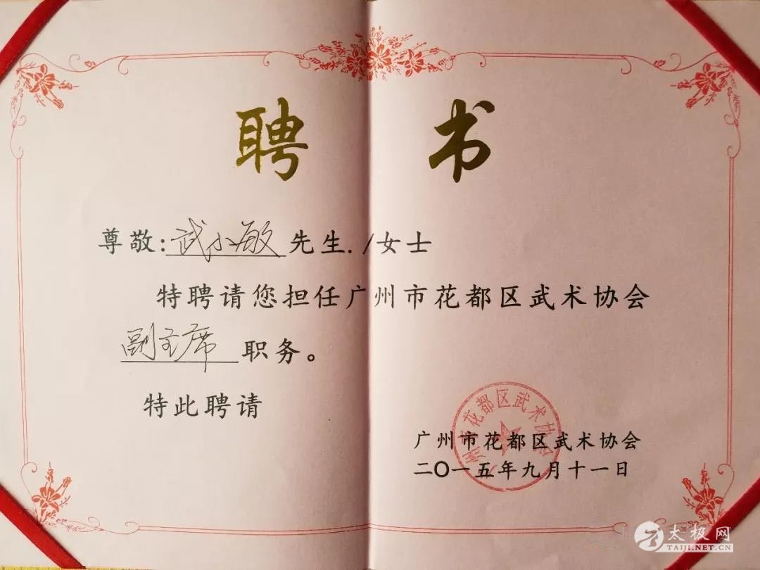 2020年6月12日,“非遗传承,健康生活”,由广州市花都区文化广电旅游体育局主办的,2020年“文化和自然遗产日”展演暨游园活动,在广州民俗博物馆举办。 武小敏老师被授予“第四批广州市花都区非物质文化遗产项目代表性传承人”称号,在“文化与自然遗产日”活动中,花都区文化广电旅游体育局领导,为6名获得第四批区级非物质文化遗产项目代表性传承人颁发荣誉证书和牌匾,武小敏老师现场接受新闻媒体采访,并为游客展示和教授陈氏太极拳。 武小敏,太极拳发源地陈家沟人,第四批广州市花都区非物质文化遗产项目代表性传承人、中国武术六段、国家武术段位考评员和指导员、国家一级社会体育指导员、一级拳师、焦作市优秀太极之家、陈家沟太极拳研究会副会长、广州市花都区武术协会副主席、广州市花都区太极拳协会副会长、陈志强太极拳推广中心馆长。 40余次获得世界太极拳健康大会、全国传统武术比赛、全国太极拳公开赛、香港国际武术节等大赛太极拳、器械一等奖和第一名。 武小敏的太极之家 2007年 10月,在陈家沟举办的全国太极拳邀请赛获陈氏太极拳金牌(第一名)、陈氏太极剑金牌(第一名)。 2008年3月,培训广州市花都区第三届老年人运动会100多名参赛运动员24式太极拳。 2008年4月,广州市花都区第三届老年人运动会太极拳比赛担任裁判员工作。 2008年8月,由广东省体育局在广州市第二文化宫体育馆举办的“广东省传统武术项目锦标赛”获得传统太极拳一等奖、传统太极短器械一等奖、陈氏太极拳竞赛套路一等奖。 2008年3月培训花都区老年人运动会100多名参赛运动员24式太极拳 2008年带学生参加广东省传统武术锦标赛获得26枚金牌、67枚银牌 2008年培训花都区法院100多名法官干警太极拳 2008年10月,陈家沟全国太极拳邀请赛获陈氏太极拳金牌、陈氏太极剑金牌。 2009年3月,温县体育局授予“优秀教练员”称号。 2009年8月,由广东省体育局在广州体育学院体育馆举办的“广东省传统武术项目锦标赛”获得传统太极拳一等奖、传统太极短器械一等奖、陈氏太极拳竞赛套路一等奖、24式太极拳一等奖。 2010年7月,由广东省体育局在广州体育学院体育馆举办的“广东省传统武术项目锦标赛”获得传统太极拳一等奖、太极拳规定套路陈氏一等奖、太极拳规定套路16式一等奖。 2010年12月,广州市花都区第六届运动会太极拳比赛担任裁判员工作。 2011年1月,被广东省体育局授予“国家一级社会体育指导员”称号。 2011年3月,“武德杯”第九届香港国际武术节获得陈氏太极拳传统类第一名。 2011年8月,由广东省体育局在广州体育学院体育馆举办的“广东省传统武术项目锦标赛”获得传统太极拳一等奖、规定陈氏太极拳一等奖、传统太极短器械一等奖。 2011年11月,被授予“河南省一级拳师”称号。 2012年8月,由广东省体育局在广州体育学院体育馆举办的“广东省传统武术项目锦标赛”获得传统太极拳一等奖、传统太极短器械一等奖。 2013年8月,被焦作市体育局和焦作市妇女联合会授予:焦作市“优秀太极之家”荣誉称号。 2014年10月,广州市花都区第七届运动会太极拳械比赛中获得太极拳第一名、太极器械第一名。 2014年11月,被中国武术协会授予“武术六段”称号。 2015年9月,当选广州市花都区武术协会副主席。 2015年10月,由中国武术协会在河南温县举办的“全国武术太极拳公开赛”武小敏获得陈氏太极拳一等奖(第一名)、陈氏太极剑一等奖。 2016年2月,温县体育局授予“先进工作者”称号。 2016年5月,被中国武术协会授予“中国武术段位制考评员、指导员”称号。 2016年5月,广东省陈氏太极拳精英赛中授予“优秀裁判员”称号。 2016年7月,广东省武术协会在海珠区全民健身活动中心举办的“广东省第九届武术精英大赛暨《中国武术段位制》中段位技术考评”获得陈氏太极拳金奖、陈氏太极剑金奖。 2016年8月,中国武术协会在佛山岭南明珠体育馆举办的“世界太极拳健康大会”武小敏获陈氏太极拳一等奖、陈氏太极剑一等奖。 2016年8月,广州市花都区武术精英赛担任裁判员工作。 2016年10月,广东省武术协会在花都举办的中国武术中段位晋级考试担任考评员工作。 2017年7月,广东省第十届武术精英大赛获得陈氏太极拳金牌、陈氏太极剑金牌。 2017年8月,广东省武术协会在花都举办的中国武术中段位晋级考试担任考评员工作。 2017年10月,广州市花都区青少年传统武术锦标赛担任裁判员工作。 2017年11月,中国武术协会在佛山岭南明珠体育馆举办的“全国传统武术比赛”获得陈氏太极拳一等奖、陈氏太极剑一等奖。 2018年8月,广东省武术协会在广州举办的中国武术中段位技术考评中担任考评员工作。 2018年9月8日,广州市花都区太极拳协会成立,当选副会长。 2018年10月13日,带领40多名学员参加国家体育总局登山运动管理中心、中国登山运动协会、湖南省体育局、湖南省旅游局主办的,中国户外健身休闲大会(东江湖站)暨“雾漫小东江”国际半程马拉松赛,分别在开幕式和狂欢晚会上表演陈氏太极拳械。 2018年10月18日,带领60多名学生参加在花都体育馆举办的广州市花都区第八届运动会暨第四届残疾人运动会开幕式群狮太极《刚柔和风》大型表演。 2019年2月,温县武术工作会议在县政府会议室召开 ,被评为“先进个人”,陈志强太极拳推