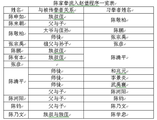 材料上写陈清平少年时就聪颖过人,喜文爱武,深得家叔陈有本的喜爱。在陈有本的精心教授下,陈清平终成陈氏太极拳的一代宗师,并培养出了和兆元、武禹骧、李景炎等太极拳开派名人。他们改编的太极拳,都不同程度地保留了陈式小架的基本风格。有人否定这些,说:赵堡太极拳是张三丰所创的拳,由蔣发传入。我翻了翻手头这些观点的几部书,有这几种传递表,不妨列出,让大家鉴别: