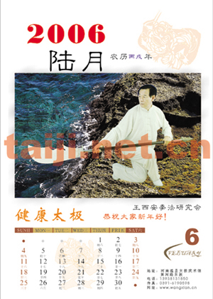 值2006年新春佳节到来之际,王西安拳法研究会首次制作了太极大师王西安先生太极拳照挂历和明信片,做工精良,制作考究,是馈赠拳友、自己欣赏和收藏的最佳选择。数量有限!欢迎广大太极拳爱好者订购! 挂历价格:45元/本(含邮资) 明信片:1.6元/枚,一套15枚(邮寄另付邮资5元) 地址:河南省温县太极武术馆 收款人:阎素杰 电话:0391-3339877 手机:13938131850 邮编:454850