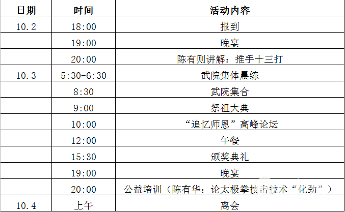 关于举办“追忆师恩”高峰论坛———陈庆州大师逝世五周年纪念活动 通 知 尊古太极体系全体弟子: 先恩师庆州公离开我们已近五年,我等尊古门人弟子无时无刻不追念先师的大恩大徳,他老人家创立的尊古太极体系越来越得到社会各界和武林同道的高度认可和推崇。为了促进后辈追思奋进,弘扬传统优秀文化,兴旺尊古太极体系,维系尊古体系长盛不衰! 现定于2020年10月2日—4日,在温县庆州武院举办“追忆师恩”高峰论坛及陈庆州大师逝世五周年纪念活动。 活动包括:祭祖大典、“追忆师恩”高峰论坛、尊古太极体系表彰大典、交流表演、公益培训等。 “追忆师恩”论坛演讲采取自荐报名形式参加,论坛演讲时间不超过10分钟,内容须是自身随陈庆州大师习拳经历,充分体现大师太极功夫、武德修养、及人格魅力。 交流展示表演项目本着自愿报名原则自荐项目,但展演时间限3—5分钟。 公益培训主讲人及内容:陈有则(推手十三打),陈有华(论太极拳技击技术“化劲”)。 具体日程安排以附件为准。 一、活动时间:2020年10月2日至10月4日 二、因疫情管控,须实名报名参加,谢绝空降。即日起开始报名,2020年9月15日截止。 三、参加活动费用:每人每餐50元、住宿每人每晚75元,服装费每人200元;本着自愿原则,食宿自理、不定制服装者不用缴费。 四、报名联系人:陈有华 联系电话:13839112830(微信同号) 五、通过陈有华微信号缴费。 六、报到时间:2020年10月2日下午14点至18点。 七、报到地点温县司马大街帝苑大酒店。 “追忆师恩”高峰论坛组委会 陈有则 陈有华 陈家强 米广盛 姜启健 梁文成 王国营 2020年9月10日 |