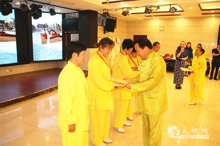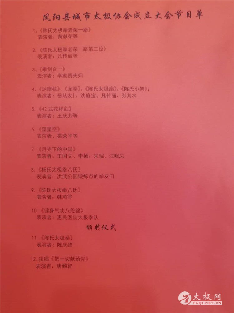 2020年9月20日,凤阳县陈式太极拳协会在凤阳县洪武大酒店举行成立大会。 协会全体成员合影 出席大会的有凤阳惠民医院董事长陈涛先生、蚌埠市陈庆峰拳友会会长陈庆峰先生、惠民医院院长王国文先生,凤阳洪武公园太极拳友会、凤阳红丝带志愿者骑行队、凤阳县凤画研究室画家唐勤智先生、凤阳县陈式太极拳协会全体会员。 嘉宾合影 上午10时18分成立大会正式开始,凤阳惠民医院董事长陈涛致开幕辞,他高度赞扬了韩燕会长对尊古太极拳传承与普及所作出的贡献,衷心祝贺凤阳县陈式太极拳协会正式成立,祝福凤阳县陈式太极拳协会越来越好。陈庆峰会长非常感谢凤阳县陈式太极拳协会的邀请,祝贺协会成立,他希望凤阳陈式太极拳协会在太极拳的道路上不断进步不断提高,努力把自己建设成凤阳优秀团队。 随后,陈庆峰老师代为宣读了太极网和温县庆州武院发来的贺电,太极网对协会的成立表示特别祝贺,希望协会在韩燕会长的领导下,刻苦钻研太极拳理论,认真习练陈式太极拳,不断进步不断提高,为普及太极拳传承太极拳做出自己的贡献;温县庆州武院同样衷心祝贺协会的成立,并表示凤阳县太极拳协会的成立使尊古太极拳得以壮大,是尊古太极拳体系的喜事,希望协会不断的按照尊古太极拳的思想习练太极拳,让更多的拳友感受尊古太极拳的魅力,争取为尊古太极拳的发展做出自己的贡献。韩燕会长感谢各位嘉宾在百忙之中参加协会成立大会,感谢各位拳友多年来的支持。 成立大会上表彰了参加2020年尊古太极拳视频大赛的参赛选手,韩燕会长、陈涛董事长、王国文院长、陈庆峰会长分别向获奖选手颁发了奖状和奖牌,拳友们展示了他们的太极风采,嘉宾们展示了他们的才艺,给成立大会增添了快乐的气氛。 |