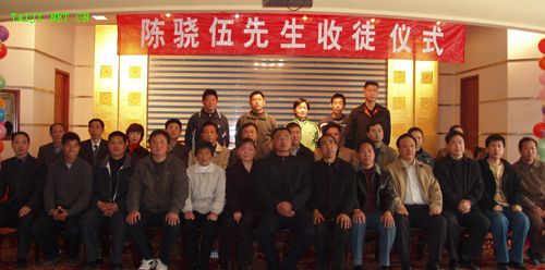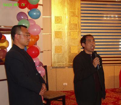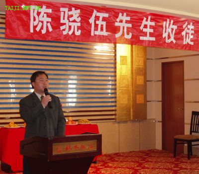 太极网总经理刘洪奇先生讲话 3月24日,焦作市槐园太极拳社社长陈骁伍先生收徒仪式在焦作秋水大酒店举行。安徽宣城的太极拳爱好者丁雪峰、刘建强自从2005年初跟随陈骁伍先生学拳以来,不远千里,多次赴焦作求教,陈骁伍先生慷慨豁达、倾囊相授,毫不保留,他们深为陈先生的拳艺和人品折服,决定拜陈骁伍先生为师。一同拜师的还有跟随陈先生学拳多年的焦作中级人民法院的王道高先生。其中丁雪峰先生习练少林拳、查拳多年,在当地小有名气,属带艺拜师。拜师仪式由河南省武协副秘书长、温县武协常务副主席原福全先生主持,来自陈家沟的当代太极名师陈素英、张福旺、陈冲、陈志强,焦作名师史潮记、郑州名师张鹏也到场祝贺。
