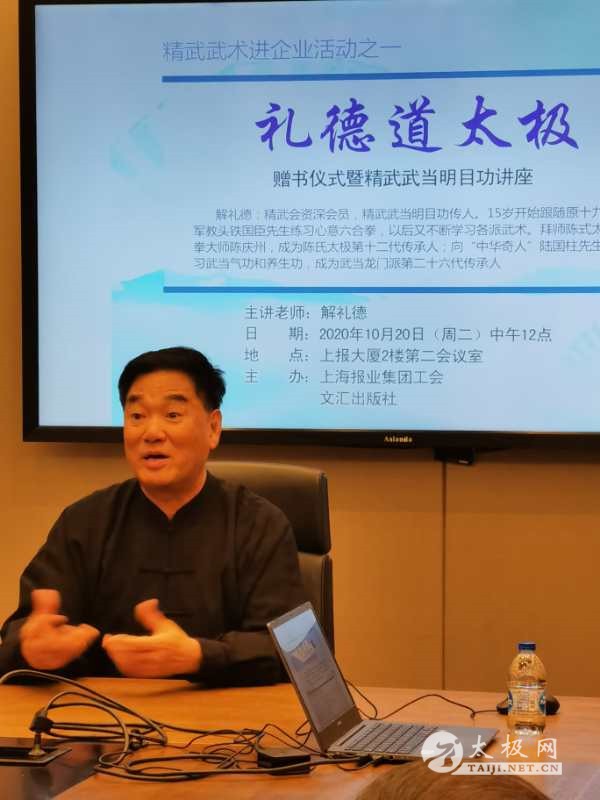 《礼德道太极》赠书仪式现场,左起文汇出版社总编辑、社长周伯军、《礼德道太极》作者解礼德、精武副总教练方婷八段、上海报业集团工会常务副主席党勇 精武会成立110周年之际,由上海报业集团文汇出版社出版的《礼德道太极》一书正式和读者见面。该书汇聚了精武三代武学名家的武学心得。10月20日中午,上海报业集团工会和文汇出版社联合主办了《礼德道太极》赠书仪式。精武会副总教练方婷八段从该书作者、太极名家解礼德手中接过了首批印发的新书。 目前精武会已在全球发展了76家精武友会,成为海派文化的一张世界级文化名片。今年全民健身日前夕,上海报业集团也有幸成为“精武武术进企业”的首批授牌单位,上报集团工会主席刘可在授牌仪式上提出,今后上报辅导站要积极参与精武的各项全民健身活动,做精武精神的践行者,全民健身的参与者,精武文化的传播者。 此后,通过上海报业集团文汇出版社和上报辅导站志愿者的共同努力,《礼德道太极》一书顺利出版,其中,精武武当明目功、武当养生功等多项精武传统武术功法也正式以书籍形式与公众见面。这是上报集团为精武文化传播作的一次小小尝试。 本次捐赠仪式也是上海报业集团“精武武术进企业”第二场系列活动。上海报业集团工会常务副主席党勇,文汇报工会主席、文汇读书周报主编张裕,文汇出版社总编辑、社长周伯军,文汇出版社副总编辑张衍、国家武术八段,精武体育总会副总教练、精武副秘书长方婷,精武副秘书长、精武传统武术研究中心主任李国华,精武静安辅导中心主任陆永祥,太极名家、《礼德道太极》作者解礼德、上报太极拳队前总教练邹国樑六段出席了本次捐赠仪式。 仪式结束后,太极名家、《礼德道太极》作者解礼德还为上报集团的记者编辑们开设了精武武当明目功讲座,让与会者获益良多。 太极名家、《礼德道太极》作者解礼德现场展示陈式太极 解礼德讲解精武武当明目功 解礼德为上报拳友解惑太极要领 武当明目功视频 本站编辑:太极网安安 |