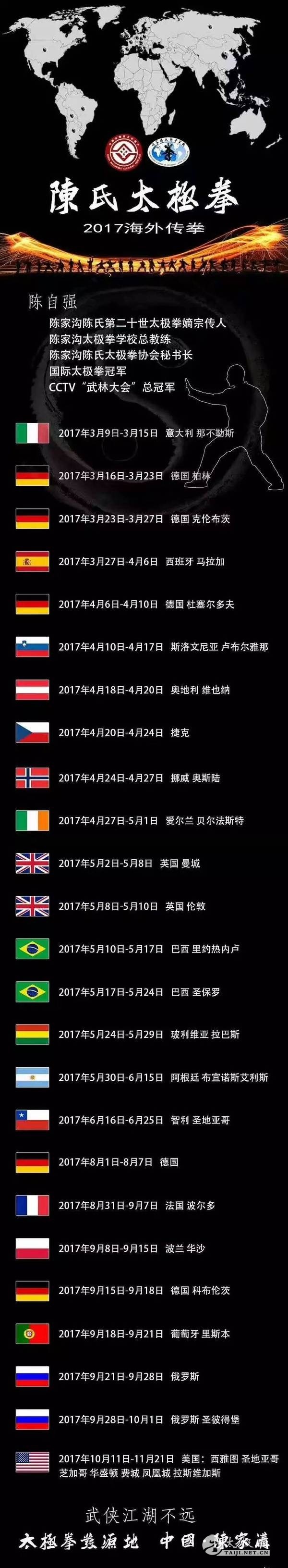 国际太极拳冠军 CCTV【武林大会】总冠军 1977年出生于“太极拳发源地”河南温县陈家沟太极拳世家,陈家沟陈氏第二十世太极拳嫡宗传人,自幼随父亲“陈家沟陈氏第十九世太极拳守门人”陈小星习练家传拳械,并得到二伯父“陈家沟陈氏第十九世太极拳掌门人”陈小旺的悉心指导,加之聪颖刻苦,勤于钻研,不仅擅长陈氏太极拳套路,以及各种器械,对太极拳推手、太极散手颇为谙熟,动作弹抖靠发、迅猛冷脆,功夫极具威力。 陈自强——武动寰宇 一、陈自强老师国外传拳视频锦集 1、国外广为流传的经典视频: 2、陈自强南美玻利维亚行拳: 3、陈自强在柏林的散推教学演示视频: