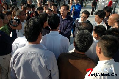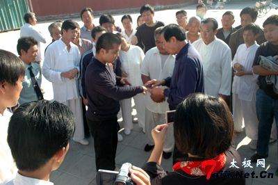 一听说太极拳大师王西安来鹿邑看望分会会员,张金山和他的弟子们都显得格外高兴。今年62岁的张金山仅比师傅王西安仅小了两岁,但20多年的师徒之情却让两位夕阳老人情同手足。用张金山的话说,都是博大精深的太极拳让相距数百里的他们结下“拳缘”,并都用毕生的心血为太极拳的传播而日夜忙碌。也因为张金山在家乡的不懈努力,王西安太极拳法研究会鹿邑分会如今已发展学员近100名,练太极拳成为鹿邑人的又一健身时尚。每天早晚,公园广场,都随处可见人们习练太极拳的身影。看来,老子故里对融入道家导引吐纳术的太极拳深爱有加。 为了满足鹿邑分会会员与大师“切磋”拳艺、提升水平的愿望,王西安特抽出一中午的时间在公园广场上进行了一场“现场培训”。徒弟们各自展示“拳艺”,师傅一一进行点评、现场正架。同时师徒之间互相切磋,师傅不时地讲述太极拳理论,现场的气氛异常融洽。短暂的歇息之际,学员们纷纷讲述了自己与太极拳不解之缘。 首先讲述的是分会会长张金山。他说,随着鹿邑人对太极拳的喜爱,传播太极拳已成了自己的职业。