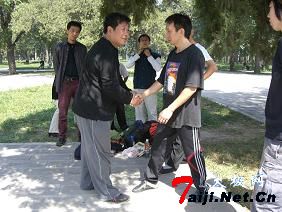 图二,已经轻松的将人在握手瞬间端起,劲路通过吃进腕子关节的缝隙,使对手整个人受控。 06年9月,师父陈瑜先生给我们讲授手,肘,肩的关系,以手找肘,再以肘找肩,肩挑动全身,轻松的将人在握手中端起,正所谓节节贯穿的劲路,清晰明了。师父在给我讲授拿法,好象不是在演示单纯的拿法,而是在给我们展示人体密码锁的开启方法。滋味很浓郁,值得品味。 胡伟航 |