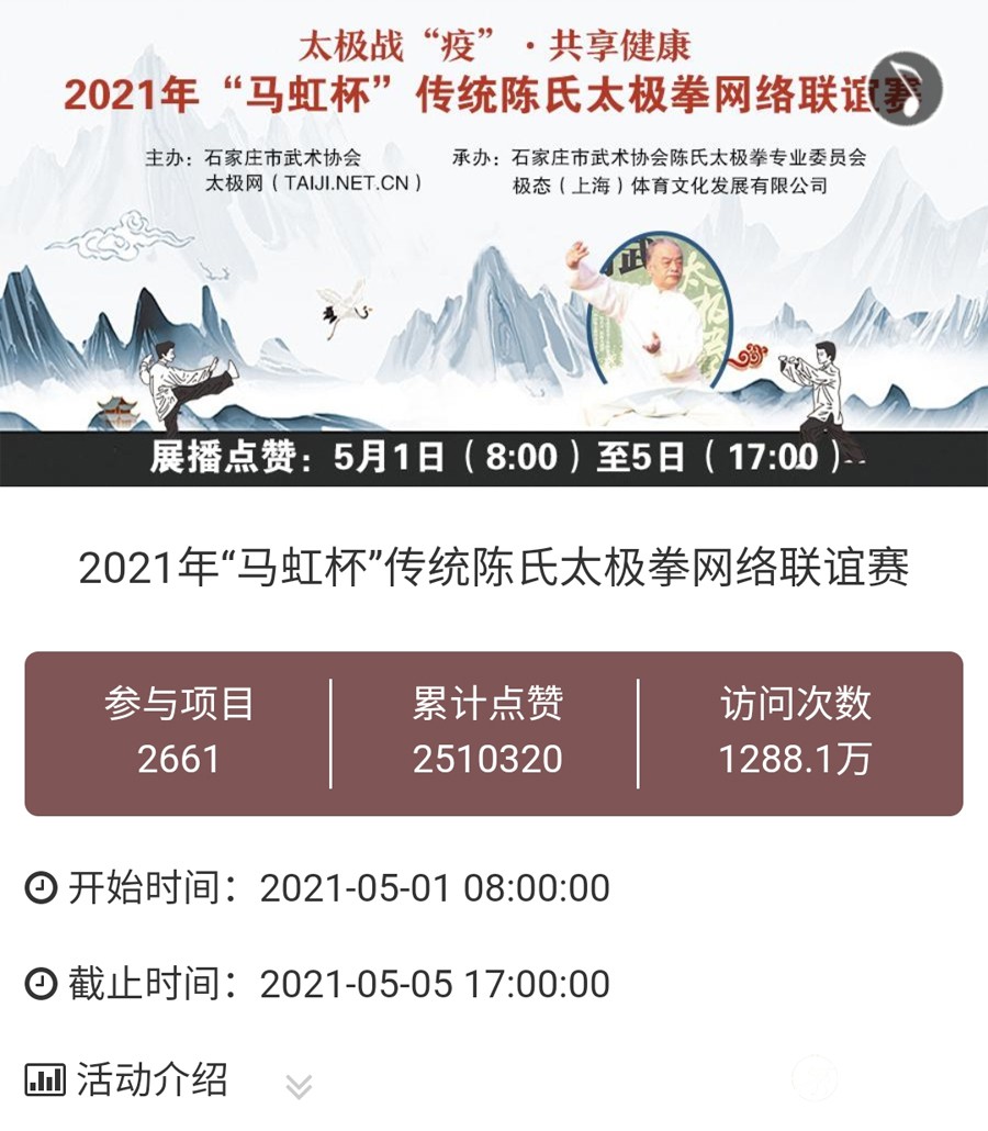 (太极网讯)为积极响应国家发展全民健身、建设健康中国的号召,响应国家体育总局关于居家科学健身、举办网络赛事的号召,石家庄市武术协会陈氏太极拳专业委员会与太极网联合发起举办2021年“马虹杯”传统陈氏太极拳网络联谊赛,活动依托“互联网+太极拳”,创新太极拳赛事活动举办模式,通过网络集中展示和宣传陈氏太极拳马虹支系的太极精神和传人风采,是马虹支系的一次网络“大阅兵”,旨在弘扬马虹精神,“网练”太极,为战“疫”加油。 本次网赛从报名至展播不足一个月,在石家庄市武术协会、太极网、石家庄武协陈氏太极拳专委会、上海极态体育文化发展公司共同努力下,组委会精心筹备,得到了马虹支系各地太极拳组织积极响应,累计3000余人参赛,精选2661部参赛作品(含集体项目)参与展播。 大赛全体同台网络展播点赞环节从5月1日开始,截至5日17:00收官,平台累计网络访问量1288余万次,投票点赞251余万次,马虹支系拳友们互动留言频繁刷屏,连续5天燃爆太极人的朋友圈! 本次网赛由在线报名、录制参赛视频、在线展播及投票、专家评审、颁奖典礼等环节组成。大赛成绩评比由网络人气分(10分)和技术分(100分)组成。本次大赛展播结束之后,技术评审工作即将开始,评审结束后统一公示成绩,届时大赛组委会还将发布颁奖典礼等线下主题活动通知,期待广大拳友们以网会友、以武会友,共享太极盛会。 大赛组委会 2021年5月5日 |
