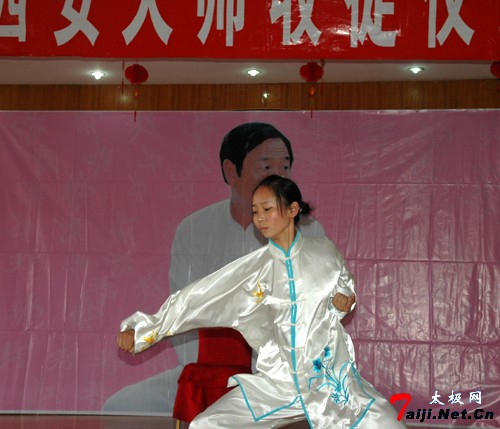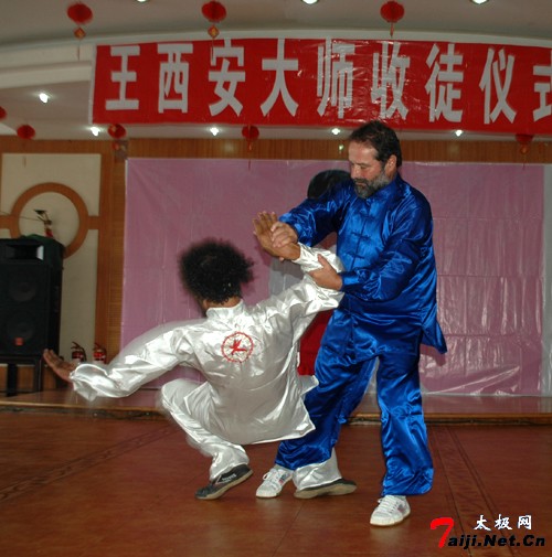 菲利普表演太极技法 在接受两人的拜师大礼后,身着大红中式短袖的王西安大师高兴地在传承书上签字盖章。勾丁那.阿兰、菲立普先生、马斌、贾重先生等也作为见证人,在传承书上签字盖章。同时,王西安大师并为郑寿杰、施荣华先生赠送绶带并颁发传承书。绶带上面分别写有:“王西安大师入室弟子施荣华、郑寿杰”字样 。这份珍贵的礼物是恩师的一份心意,两位弟子高兴地将它悬挂在胸前,和大家合影留念。为了表达对恩师的感谢,两位正式入门弟子特意在北京请书法家为恩师书写了“渊源流长,根深叶茂”的精美书法作品,字里行间,皆是弟子的感恩之情。