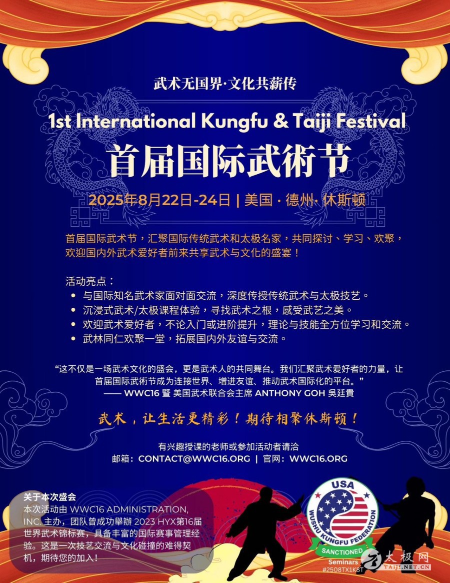 (特邀记者钱承飞)由WWC16世锦赛团队主办的首届国际武术节(1st International Kungfu & Taiji Festival)将于亚太裔文化传承月(五月)中开启报名通道。正式活动将于2025年8月22日至24日在美国德克萨斯州休斯顿举行。连续三天的武术节将涵盖传统武术、太极拳、竞技套路、散打和气功养生等类别的专题课程,既适合武术入门、也有助于精修。此外,活动还安排名师表演和师生互动环节,以及武术推广与发展的讨论,展现武术在世界民众健康、教育和文化传承中的多重价值,期待汇聚来自全球的武术教育者、爱好者、传统文化推广者、社区活动组织者,以武会友,共同收获武艺进步和武学理念提升。 武术源于中国,属于世界,拥有悠久的文化传承,尤其在亚太地区广受喜爱。早在1990年,北京亚运会就已将武术列为正式比赛项目;2026年,武术更将作为正式项目亮相达喀尔青奥会,持续走向更宽阔的世界舞台。在新时代如何推广和发展武术,一直是武术人共同关注的课题。传统武术是武术之根,唯有在“继承”与“薪传”中融入时代需求,不断创新发展,才能使武术成为有鲜活生命力的新传统。本次活动也正是一次结合时代特色、继往开来、推动武术体育化、教育化、科学化与大众化的新探索。本届武术节倡导在放下竞争意识的氛围中,构建开放包容的平台:通过课程订阅,让不同水平的武术人学有所获;通过交流探讨,让不同背景的武术人相互连结,希望实现理念共鸣,实践共行,共同推动武术的广泛传承与蓬勃发展。 WWC16暨美国武术联合会主席吴廷贵(Anthony Goh)表示: “这不仅是一场武术文化的盛会,更是武术人与爱好者的共同舞台。我们汇聚大家的力量,让首届国际武术节成为连接世界、增进友谊、推动武术国际化的平台。” 诚邀大家参与!欢迎访问官网WWC16.org 获取注册信息与更多活动详情。 |