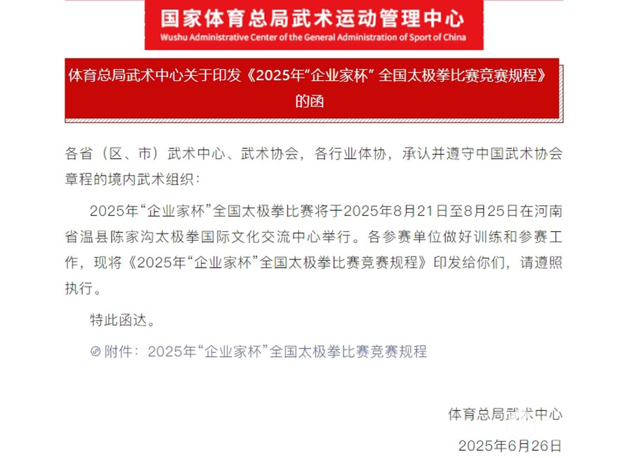 2025年“企业家杯”全国太极拳比赛竞赛规程 一、竞赛时间和地点 2025年8月21日至8月25日,在温县陈家沟太极拳国际文化交流中心举行。 二、主承办单位 主办单位: 国家体育总局武术运动管理中心 中国武术协会 承办单位: 河南省武术体操冰雪运动中心 焦作市体育局 温县人民政府 协办单位: 温县太极拳武术文化发展中心 温县体育运动发展中心 运营单位: 温县启程体育文化发展有限责任公司 三、竞赛项目 (一)个人项目 1.太极类规定项目 (1)太极(八法五步); (2)24式简化太极拳; (3)42式太极拳竞赛套路; (4)32式太极剑竞赛套路; (5)42式太极剑竞赛套路; 2.太极类传统项目 (1)陈式太极拳:陈式太极拳竞赛套路56式、其他陈式太极拳传统拳术及器械; (2)杨式太极拳:杨式太极拳竞赛套路40式、其他杨式太极拳传统拳术及器械; (3)吴式太极拳:吴式太极拳竞赛套路45式、其他吴式太极拳传统拳术及器械; (4)武式太极拳:武式太极拳竞赛套路46式、其他武式太极拳传统拳术及器械; (5)孙式太极拳:孙式太极拳竞赛套路73式、其他孙式太极拳传统拳术及器械; (6)和式太极拳、王其和太极拳及其他太极拳传统拳术及器械。 3.个人展示项目:太极拳套路类和太极器械类,不分年龄,按男子、女子两个组别,四个项目,每支代表队可推荐男、女各1人。 4.其它项目:除太极拳、太极器械以外的传统武术拳术及器械。 (二)集体项目 1.太极拳集体项目。 2.太极器械集体项目(含徒手与器械混编)。 四、参加办法 (一)每队可报领队1人,教练1人,运动员不超过20人,随行人员不限,可由本单位或与合作单位联合组队参赛。企业高级管理人员、法人或相关负责人至少1人报名参加,冠名企业代表队的在职员工不少于三分之一。 (二)每名运动员限报拳术2项、器械1项,其中至少有1项为太极类,可兼报集体项目。 (三)参加集体项目人数不少于6人,不超过12人。运动员性别、年龄组别不限,可混合编组,可在本集团、子公司或本系统内部联合组队。 五、参赛资格 (一)凡在中国境内依法合规、正常运营,热爱支持武术事业,致力于增进全民健康,广泛参与全民健身及社会公益活动,并经工商部门注册许可的各类企业单位,均可以组队报名参加。 (二)凡国家体育总局武术运动管理中心、中国武术协会,以及各省(区、市)武术主管部门、武术协会的赞助企业、合作企业和赞助商等相关单位,组委会可邀请优先组队参加。 六、竞赛办法 (一)比赛执行中国武术协会审定的《传统武术套路竞赛规则(2024)》及有关补充规定。 (二)规定项目中陈式、杨式、吴式、武式、孙式、和式竞赛套路,以及42式太极拳、32式太极剑、42式太极剑均为原国家体委武术研究院审定的竞赛套路。 (三)集体项目人数不足6人将按照规程规则进行扣分;有1名企业法人、董事长,总经理等高层管理者参加,每人可由裁判长加0.1分,最多可加0.3分。 (四)年龄分组 青年组(C组):30岁至45岁(1980年1月1日至1995年12月31日出生者); 中年组(D组):46岁至59岁(1966年1月1日至1979年12月31日出生者); 老年组(E组):60岁及60岁以上(1965年12月31日之前出生者) (五)完成套路时间: 1. 传统各式太极拳、械,完成套路时间为3-4分钟。 2. 国家规定太极拳、械套路,完成套路时间为3-6分钟。 3.其它项目不超过2分钟。 4.集体项目不超过6分钟。 (六)集体项目场地无边界要求。 七、录取名次与奖励 (一)个人项目:按各单项男、女分别设一等奖30%、二等奖30%、三等奖40%,颁发获奖证书和奖牌。 (二)集体项目:按各项目分别录取,一等奖30%、二等奖30%、三等奖40%,颁发获奖证书和奖匾。 (三)设“最佳男运动员奖”“最佳女运动员奖”“最佳技术奖”“最佳表演奖”“最高人气奖”“武德风尚奖”。评选办法另定。 八、配套活动安排 (一)在本次大赛期间,将举办“太极拳名家课堂”,届时将邀国内知名的太极拳名家进行专题讲座、技术辅导,以及互动交流等丰富多彩的配套活动,凡参加本次比赛的运动员、教练员、领队及随行人员均可免费报名参加。 (二)本次比赛个人成绩可作为认定武术段位1-6 段依据。凡比赛成绩和资格达到晋升相应段位的参赛者,由本人提出申请,通过“中国武术APP”自行申报,或向所在地段位制办公室进行申报,可按照《中国武术段位制管理办法(2024)》相关规定完成赛后段位认定工作。 九、报名与报到 (一)报名 1.报名方法:通过“中国武术APP—业务中心—社会武术—武术赛事——公布与报名”入口,按照提示进行操作,完成报名手续。 报名服务电话:4008286335 2.报名截止时间:2025年8月10日24时。 3.本次大赛报名方式为网上报名,请各参赛队由领队统一在规定时间前完成网上报名,并将所报人员身份证复印件、责任声明书(手写签字)、人身意外保险单(责任免除条款中不得包含武术比赛)按规定拍照上传至报名网站。报名成功后打印一份报名表留队备查。 4.请参赛运动员报名时将个人习武简介(300字以内)及2-3张武术动作照片发送电子邮件wxwszxjsg@163.com,以便印制宣传册、宣传展架。邮件命名为“企业家杯比赛—队伍名称—运动员姓名”。 (二)报到 1.请各参赛队于2025年8月21日下午5点前报到。报名截止后,大会组委会安排专门会务人员与各代表队联系入住酒店事宜,报到时请各队领队收集好本队所有人员身份证在酒店报到处办理住宿。 2.请各参赛队于2025年8月15日前务必将抵达的具体