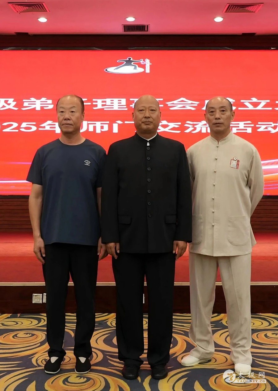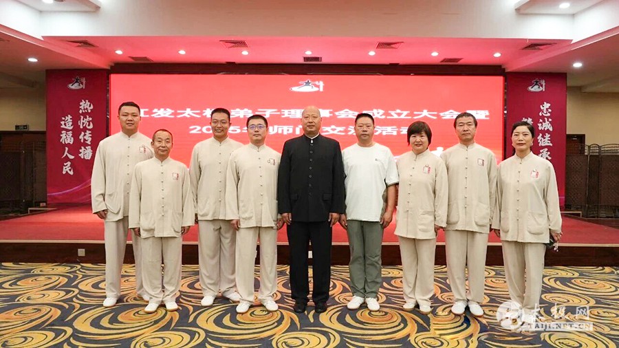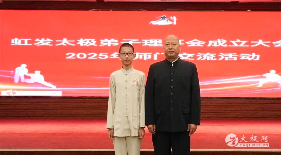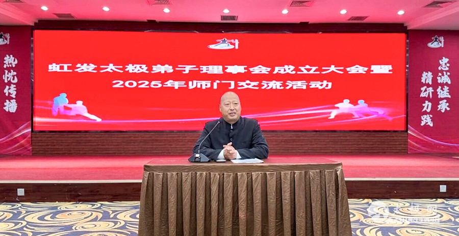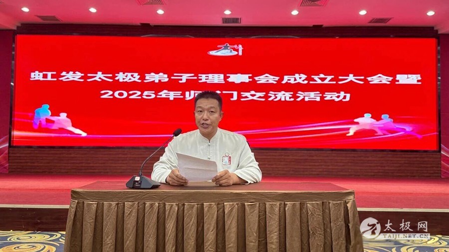 《水调歌头·虹发太极师门交流》 曙照拳旗动, 少长聚石门。 虹发同脉, 百侣白衣接晴暾。 刀起秋风落月, 剑啸清霜飞电, 拳影写乾坤。 师语千钧重, 弟子共铭恩。 童步稳,壮势阔,老姿尊。 同台一笑,万国和气此中生。 且把国粹远播, 任他岁月更迭, 薪火自长存。 来日再相会, 拳意满乾坤。 10月1日下午,虹发太极拳弟子理事会成立大会后,2025年虹发太极师门交流活动在石家庄阳光格瑞酒店举行。百余名虹发弟子以拳会师,以心立规。 杨合发先生展示陈氏太极拳