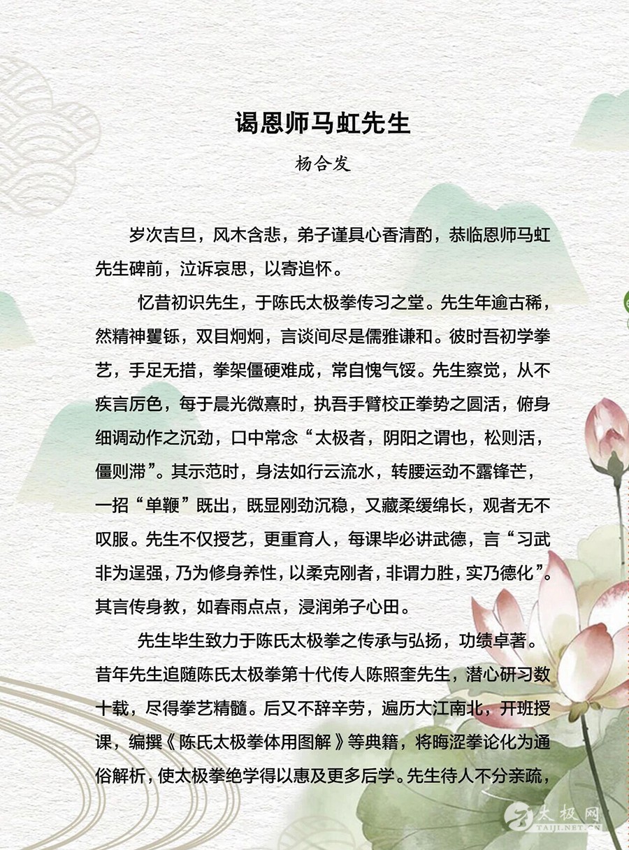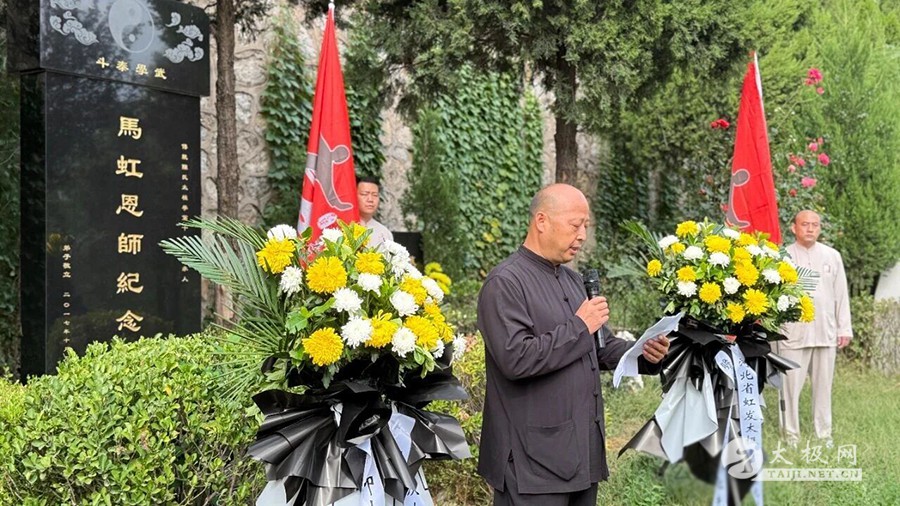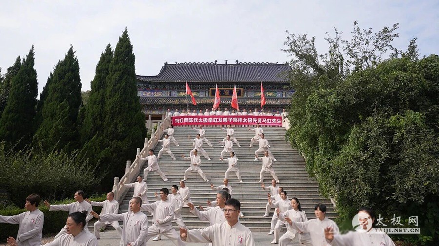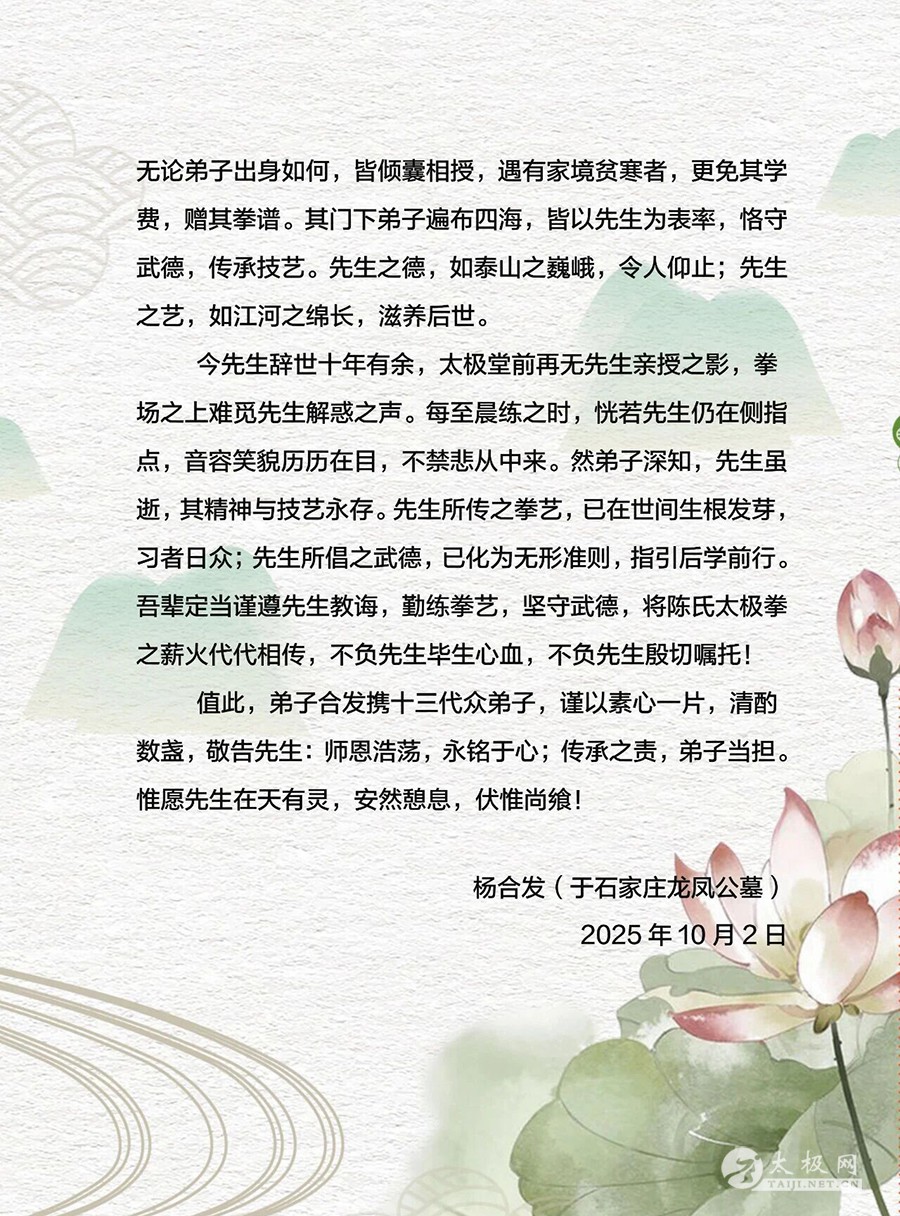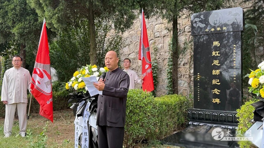 随后,队伍移至马虹恩师纪念碑前,杨合发先生诵读亲笔祭文:“当谨遵先生教诲,勤练拳艺,坚守武德,将陈氏太极之薪火代代相传,不负先生毕生心血,不负先生殷切嘱托”。语至动情处,全场低头致敬。郭彦芬女士寄语年轻一代“以拳载道,以德育人”,铿锵之声回荡碑前。 祭礼毕,弟子们在广场列阵,集体展演陈氏太极拳。松沉弹抖,开合有致,白衣翻飞如浪,拳风掠过松柏,仿佛向先师汇报最新答卷。 “每一次祭拜都是一次启程”。虹发太极将把今日肃穆化作明日动力,继续深耕公益教学、社区推广与国际交流,让马虹精神随拳势传遍五洲。 祝马虹先生拳魂长驻,愿将今日拳声,化明日传承,永护太极星火。