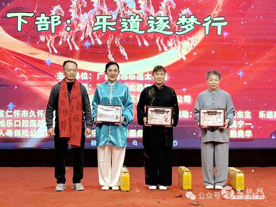 2026年1月17日,以“马踏星河来,乐道逐梦行”为主题的广西南宗乐道太极院2026年会盛典在南宁举行。南宁市武术协会领导、各界精英人士与来自四面八方的乐道学员齐聚一堂,在辞旧迎新、万物向荣的美好时刻,共赴这场兼具古韵与活力的年度盛会。 广西南宗乐道太极院院长董志鸿致欢迎词 董院长在致辞中,对过往一年太极院的工作进行了细致回顾与总结,同时表达了对未来的美好憧憬,期许与大家继续深耕太极之道,让这门传统技艺惠及更多人,为健康生活赋能。真挚的话语直抵人心,让在场众人充满了笃定前行的力量。 年会现场亮点纷呈,惊喜不断。来自广西梧州、桂平、百色、浦北、北流、北海等地辅导站的师兄师姐们,带着浓厚的乡音与拳情远道而来,与太极院学员联袂献艺,以刚柔并济的招式演绎太极拳的无尽魅力,让现场观众深切感受中华武术的独特韵味。 西安乐道太极馆馆长董曙光带来的至精至微的小架展演,赢得全场阵阵喝彩。 作为压轴节目,董志鸿老师的新架二路展演,更是将现场气氛推向高潮,掌声经久不息。 年会对2025年度表现突出的学员进行了表彰。 2025年“大拳师杯”第十一届太极拳网络视频大赛获奖学员 右起:唐珂 丁纯 方凯旋 吕小兰 范东凤 申柳群 郭娟 2025年“大拳师杯”第十一届太极拳网络视频大赛获集体项目一等奖的学员 董志鸿老师为“不忘初心”元老奖获得者颁奖 左起:安小四 董老师 颜彩婷 梁海涛 南宁市武术协会秘书长黄沛良先生为“勇于拼搏奖”获奖者颁奖 左起: 李运雄 方凯旋 丁纯 滕日生 郭娟 “积极进取奖”获得者 右起:郭娟 唐珂 丁纯 回首2025,乐道太极人以拳为伴,在一招一式中锤炼身心,于一开一合的起伏辗转间体悟阴阳之理。展望2026,乐道太极将继续秉持“共享太极 共享健康”的理念,携手广大太极爱好者,将太极智慧与健康之道,传递给更多热爱生活的有缘人,让太极之路走得更加精彩、宽广。 图文来源:广西南宗乐道太极院 本站责编:宋丽丹 |