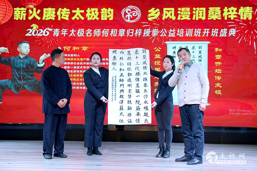 2月4日,农历马年立春日,青年太极名师何和章归梓授拳公益培训班在监利市隆重开班。监利市委宣传部、市文化和旅游局、市融媒体中心、市图书馆、容城镇国庆社区、市老年体育协会等单位相关领导出席开班仪式,全市500余名太极拳爱好者、学生代表齐聚现场,共迎新春、共习太极。 何和章是从监利走出的青年太极名师,为陈式太极拳第十三代传人、东莞和正太极拳馆创办人。此次他心系桑梓,返乡开展为期十天的公益授拳活动,旨在丰富市民节日文化生活,让家乡群众感受传统武术的独特魅力,以实际行动践行全民健身理念。 开班仪式上,监利市图书馆为何和章颁发公益讲师聘书和图书典藏,致谢其为监利文化体育事业发展所作的积极贡献。 何和章老师致辞 学员代表何鸿湄发言 笔墨寄情,太极传心。原监利市人大常委会主任、监利市老年大学校长、监利市太极拳协会顾问常尧阶,为何和章赠送纪念墨宝,并宣布本次太极拳公益培训班正式开班! 何和章现场展演陈式太极拳,招式行云流水、刚柔相济,尽展太极精髓,赢得全场阵阵热烈掌声。随后,他开讲公益公开课,围绕陈式太极拳的阴阳变化与缠丝劲技法展开教学,耐心讲解拳理与动作要领;不同年龄段的参与者认真揣摩、跟练研习,现场学习氛围热烈浓厚。 本次公益培训班全程免费,覆盖中老年群体与青少年群体,培训将持续至2月13日。活动以立春启序、以太极为媒,既传承中华优秀传统文化,又为新春佳节增添了浓郁的文化韵味。监利市将以此次活动为契机,持续开展各类公益文体活动,大力普及太极文化,让全民健身的热潮融入市民日常生活,为文化监利建设注入新的活力。 来源:湖北日报 通讯员:何鸿湄 图:徐祖林 |