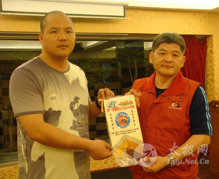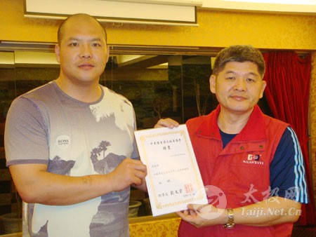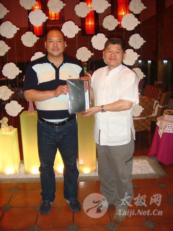 中华陈家沟太极拳协会理事长刘文宗向王战军颁发聘书 中华陈家沟太极拳协会理事长刘文宗向王战军赠旗 王战军向刘文宗赠送新著作《陈式太极拳实战技击》。