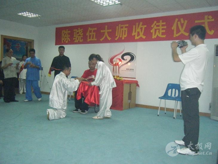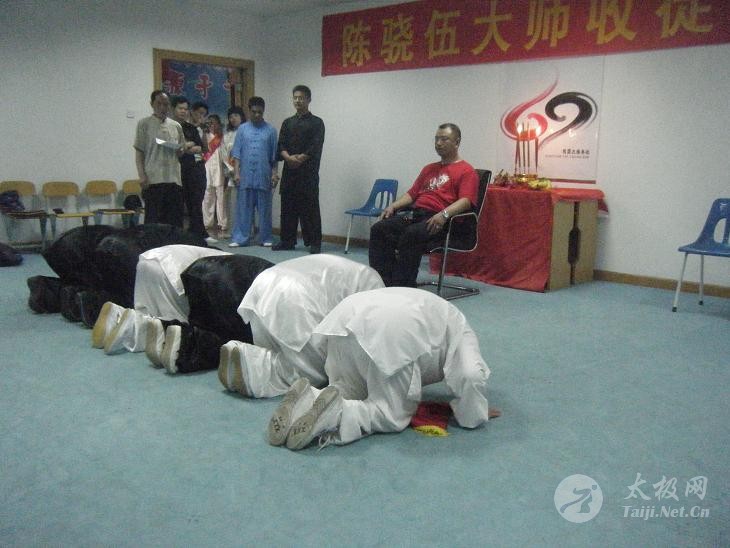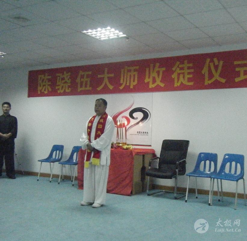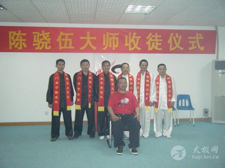 2010年5月26日在广东东莞市清溪槐圆太极拳馆槐圆太极拳广东培训基地,陈骁伍大师在这里举行了隆重的收徒仪式。来自河南安徽 湖南 香港 广东的李天敬 龚高 孙钱龙 骆成杰 陈金辉 魏志才六位武术爱好者拜入陈骁伍大师门下。    清溪镇商会创会会长,永远名誉会长,清溪太极拳研究会会长黄华精先生;清溪镇成教局主任殷志峰先生; 清溪镇文化中心主任 陈淦凡先生;东莞市智囊团法律咨询有限公司总经理,清溪太极拳研究会副会长王黎明先生参加了陈骁伍大师收徒仪式。  会长黄华精先生做来宾发言,对清溪太极拳的发展充满信心。参加仪式的还有清溪各界太极拳爱好者及陈骁伍先生已入门弟子。  来自河南三门峡的李天敬做弟子代表发言。李天敬先生1949年出生, 现年62岁,六八年随许昌拳师禄天华先生学习长拳,有黑虎拳,查拳,四把锤等,九零年习练太极拳,1991年参与组建三门峡习武健身友谊会任秘书长。2002年参加三门峡陈式太极拳研究会任副秘书长。李先生对自己拜入大师门下激动之情溢于言表,当场赋诗一首: 相识吾师已多年 经来结得太极缘 眼拙不见泰山高 五内感怀颜觉忏 六十学艺未为晚 随师再学六十年 探得太极阴阳理 “朝闻夕死”是心愿 |