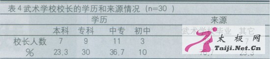 武术学校校长的学历普遍较低(表4),在走访的30所学校中校长具有本科学历的只占23,3%,专科学历占30%,中专学历占36 7%,初中学历有10%,出现这一现象的主要原因是武术学校的校长有76 7%是自幼习武,痴迷武术,毕业于武术学校。为了谋生和完成自己的心愿,自筹资金开办武术学校,其自身没有接受过高等教育,很少专门接受过学校领导专业知识方面的教育,他们本身也能够意识到学校办学存在的问题,可是在制定出有效的策略时就会受到自身知识水平的限制。
