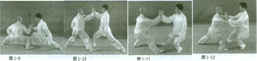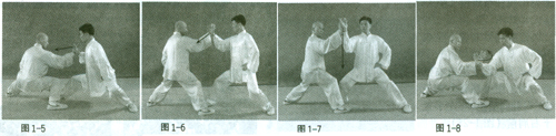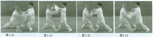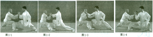 太极拳的制人功夫训练,就是在自制功夫的基础上,充分发挥“太极预应状态”和各项运动素质的优势,运用各种技术、战术去控制和战胜对手的功夫。 与其他技击术一样,太极拳也是以踢、打、摔、拿作为其基本的技击技法。但太极拳对这些技法的运用,不是单纯地为了令对手受到杀伤和破坏,而是以控制对手的“劲路”,达到彻底控制对手运动能力为目的。也可以说,各种技击技法只是手段与方法,制人才是目的。以控制对手为目的的制人功夫,是太极拳技击特点与优势的所在。 太极拳的制人功夫,有其十分丰富的内涵和训练方法,我们将介绍一些简单实用的训练实例,以供读者参考。 一、太极拳推手训练示例 为了更好地掌握制人功夫,太极拳的前辈们总结和创造了太极拳推手练习,通过一系列的推手练习,一来可以继续提高练习者的自制功夫,二则可以掌握有效控制对手“劲路”的方法,为进一步在运用各种技法与对手对抗时,能够时刻体现控制对手“劲路”的效果。 (一)练习性推手训练示范 练习性推手,就是练习双方在和平共处,或者以上、下手配合的条件下,以不同的练习方法进行磨练,以期 达到在有外力的条件下,能继续保持自己的“太极预应状态”,并且熟练掌握制人的技法。各式太极拳均有其十 分丰富的推手理法与训练形式,我们介绍其中最基本和实用的练法,供读者参考。 平圈单推手练习法 预备式: 甲(右)乙(左)双方下坐成马步,左手叉腰,右手在身前互搭,保持“太极预应状态”(图1—1)。 动作一: 甲方以“丹田”领劲,整个“太极气势中心”向前推逼;右手略向右前方推出;乙方重心后移,同时右手后引(图1—2)。 动作二: 乙方主动右转,右臂略内旋和向右引带;甲方相应左转,右臂随着乙方的引带向左前方外旋拉伸(图l—3)。 动作三: 乙方主动进逼,右手略外旋和向右前方推出;甲方重心后移,右臂向体前引带(图l—4)。