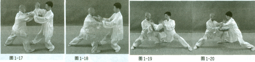 动作六: 乙方重心前移,双手分别轻按于甲方右手腕与肘关节往前上推;甲方顺势后移,左手扶按于乙方右肘处(图1-17)。 动作七: 乙方成弓步挤式,甲方后坐成按式(图1-18)。 练习要求: 练习双方在进退和双手缠绕划圈过程中,要特别注意松沉的调节,劲要沉塌住,手臂要松柔,动作要求方中有圆,连绵不断。熟练后,应进一步体会整个“气势中心”的“鼓荡劲”和“螺旋劲”。 顺步双推手 预备式: 甲方出右脚下沉成马步,右臂前伸,掌心朝上,左手置于右肩前;乙方出左脚踏于甲方右腿外侧,两膝相靠,右手搭与甲方手腕处,左手置于甲方右上臂中段(图1-19)。 动作一: 甲方右转成弓步,左手曲臂前挤,右手顺乙方左前臂下摆,掌心朝下;乙方顺势微左转,左手腕与甲方左手腕互搭,右手轻按甲方左肘关节处。(图1-20)。