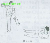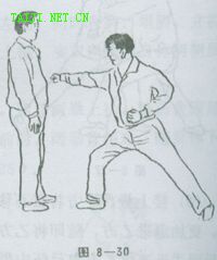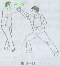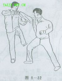 陈式太极拳套路的招招势势,无一处不包含着变幻万端的技击玄机,灵活运用,进退攻防,逢凶化吉,无所不胜。金刚捣碓在攻防实战中运用尤为广泛,可变化出层出不穷的奇招。这里仅列举其中40例实战变化,读者可举一反三,自己琢麝其它招式在攻防当中的奥妙。![]() 7.上避下踹 (1)甲方太极起式站立,乙方上右步,出右拳直攻甲方前胸(图8—30)。 (2)接上式,甲待乙方右拳击来时。伸右手由下向上掤住乙方冲来之拳,同时身体向右旋转90度,重心移至左腿,右脚尖微微上翘,此时乙方进攻力量已被化解(图8—31)。 莽莽撞撞冲来拳,气势汹汹打胸前;转身迎闭捋往上,一招进攻惊无险。 (3)按上势,甲方重心右移,出左手捋住乙万大臂,同时含胸、收腹、提膝将乙方右臂向上领起,错导乙方感觉(图8—32)。 (4)接上势,甲随即以左脚内侧直踹乙方右膝盖,一举破敌(图8—33)。顺着来势向上提,惊愕之间一愣神,击我莫若会天地,提膝侧脚直踹膝。 ![]() |