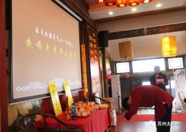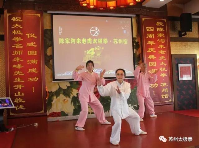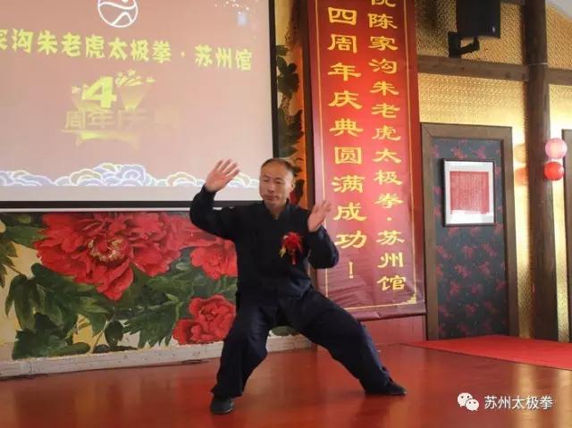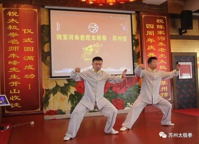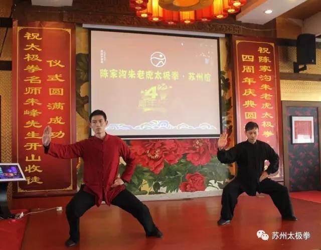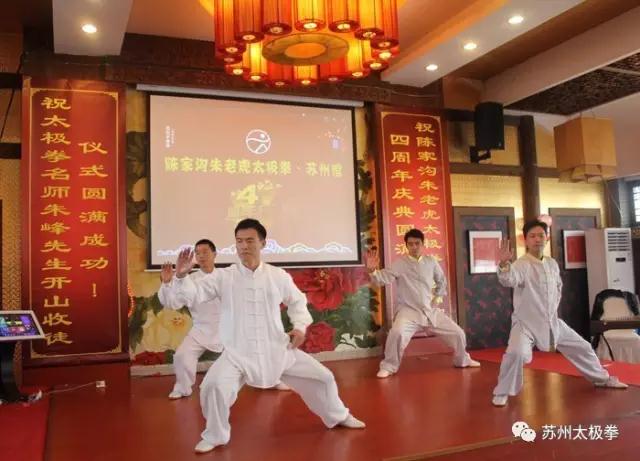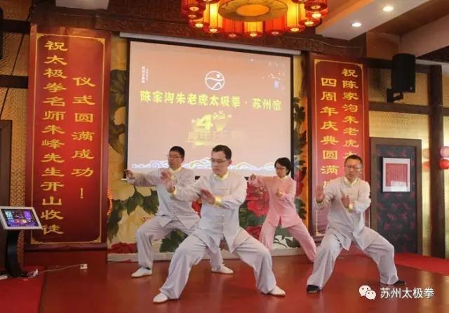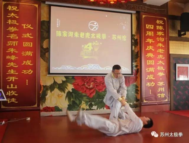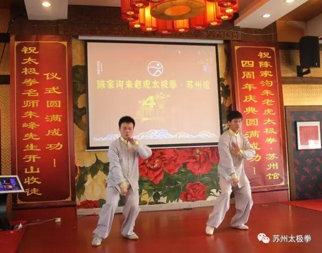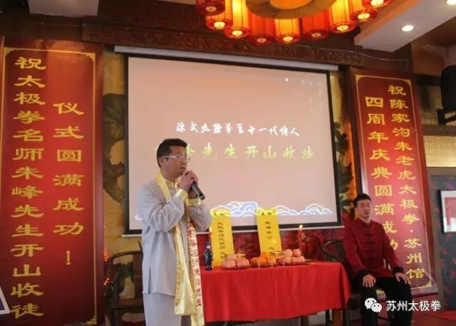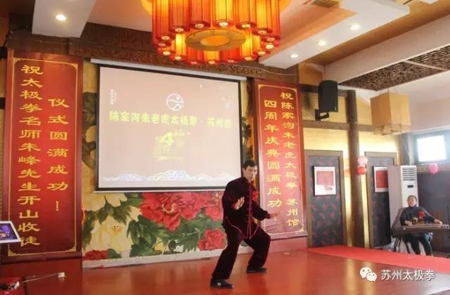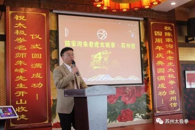 陈家沟朱老虎太极拳苏州馆成立于2012年,由陈氏太极拳第十一代传人、国际太极拳文化传播大使朱峰先生担任馆长兼总教练,拳馆历经四年的发展,在授课模式,壮大队伍,提高拳艺等方面逐步完善,使得陈氏太极拳这枝武术奇葩在苏州生根发芽。朱峰馆长在庆典仪式上首先致欢迎词,对各位领导、嘉宾、学员们长期关心和支持拳馆发展表示感谢!同时,感谢恩师朱老虎的悉心栽培,因为有他的严格要求和精神的指引,才有今天所取得的成绩。朱峰馆长表示,拳馆将继续本着传承太极拳文化的重任,团结社会各界,为太极拳的发展壮大而努力。
