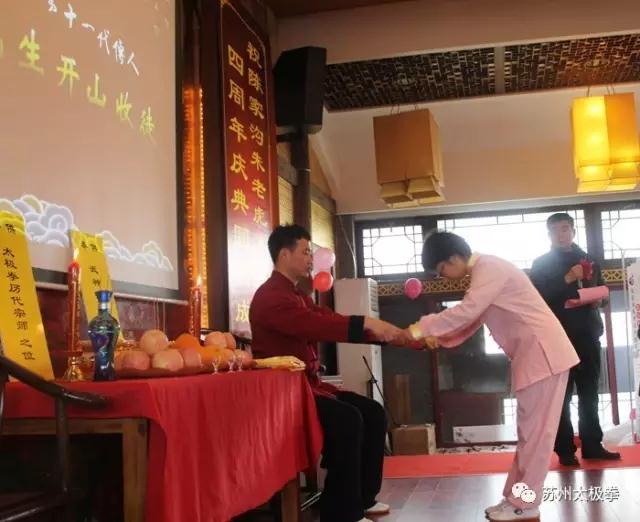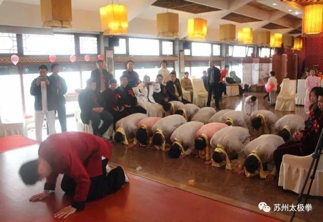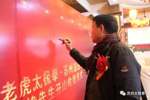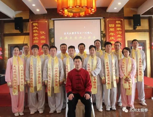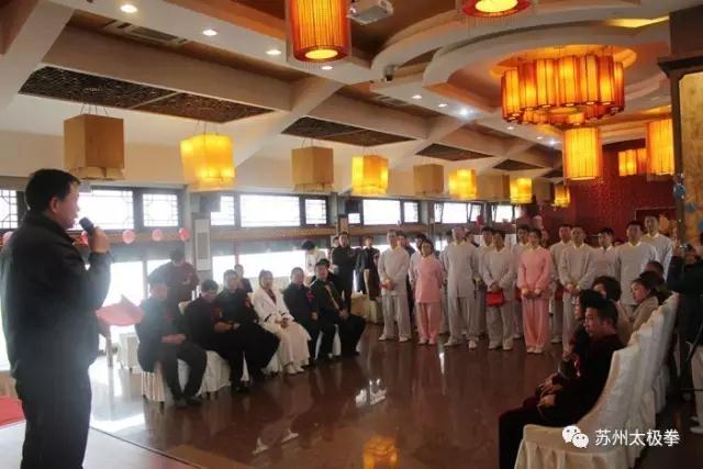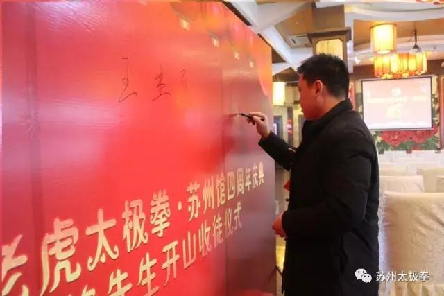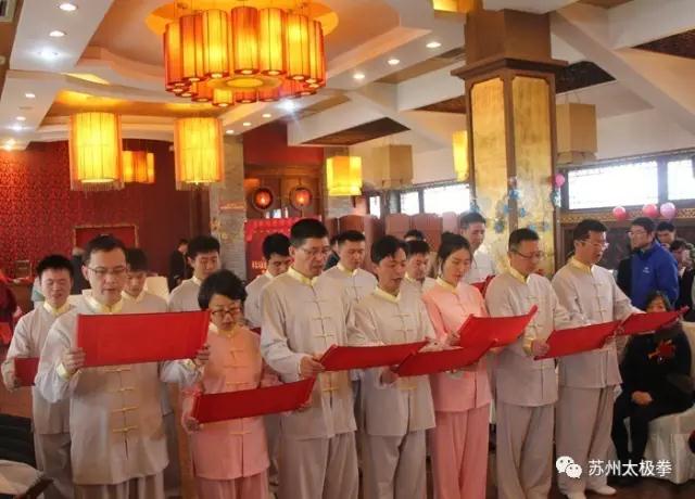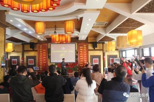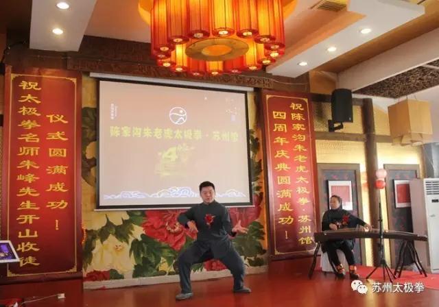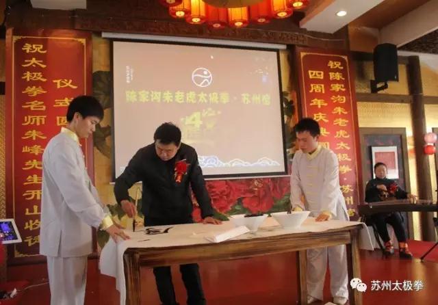 元月1日,陈家沟朱老虎太极拳苏州馆四周年庆典暨朱峰开山收徒仪式在美丽的金鸡湖畔凌轩阁大酒店隆重举行。陈家沟朱老虎太极拳功夫总院副院长朱堡垒,中国当代著名书法家王杰民,苏州市市容市政和历史街区景区管理局处长朱明华,苏州大学武术系副主任、硕士生导师张宗豪,苏州天园景观艺术工程有限公司董事长张平,苏州市徐州商会秘书长董双庆,翰泰工贸有限责任公司董事长胡银行,永康朱老虎太极拳法研究会会长任保才、主教练任保良,海宁朱老虎太极拳馆馆长辛红庆,陈氏太极拳第十一代传人朱路,贵州市朱老虎太极拳馆馆长唐笑笑,金芒果教育创始人王雨涵,鑫源古筝私塾耿琦、李岩以及来自永康、海宁的拳友和拳馆的学员们欢聚一堂,共同见证拳馆在苏州的发展历程。