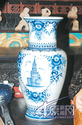 中国传统的青花瓷瓶上是克里姆林宫的画面,普京赠少林寺的礼品象征中俄文化交流的源远流长。