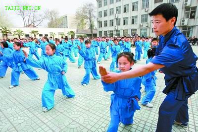 为进一步弘扬少林武术,郑州市政府近日决定在全市小学推广普及少林拳,郑州市体育局已结合小学生的特点组织编排了一套集纳少林武术精华、共30个动作的简化少林拳并在部分学校进行试点教学,中原区和管城区的9所小学的万名学生已进行了首次学习。5月下旬,该局将组织试点学校进行成果展示,并邀请有关专家对简化少林拳进行评审,下半年在全市小学推广。图为简化少林拳进校园启动仪式上,中原区育红小学近百名学生在体育老师的指导下,在操场上一招一式地练起了简化少林拳。 |