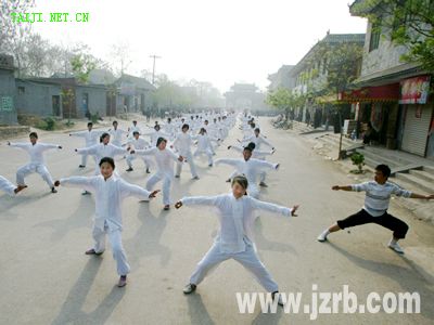 下午,热情的温县人民用太极盘鼓欢迎来自远方的客人。在陈家沟太极文化村300米长的太极街,陈家沟太极拳学校的230名学生用7个武术方阵向客人展示着太极拳、太极枪、太极大刀、太极剑、太极双刀的神奇魅力,他们的精彩表演赢得了考察团成员的阵阵掌声。在太极拳祖祠大院,来自市敦煌古筝学校的11名学生弹奏着《春江花月夜》,陈家沟两名太极拳名师和着这首舒缓的古典名曲投入地表演着太极拳老架一路。音乐与武术的完美结合不仅使考察团成员大开眼界,而且也对太极文化产生了浓厚的兴趣。