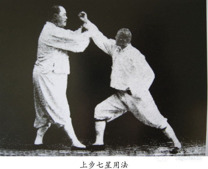四、膝关节扭伤的预防 (一) 练拳前的预备活动 一般练拳选在早晨,因机体经数小时睡眠之后,全身肌肉及韧带尚处于紧张状态,练拳以前活动下体肌群,为防止膝关节扭伤,实属必要。一般练拳者祇需两足并拢,两手按于两膝上方,两膝关节作伸屈的同时,做顷刻之顺时针及逆时针方向旋转即可,使股四头肌及股二头肌等对抗肌与膝关节周围韧带逐渐适应伸展、屈曲及旋转运动,中老年人毋须像其它武术那样弹腿与踢腿的适应性运动。 (二) 运动量宜由浅入深 杨式大架有高架、中架、低架之分,其区分之处在于膝关节屈曲度大小之不同,从而产生拳架体位有高低之分。其明显之处主要在于弓步拳架步幅之大小,高架者步幅小而运动量小,低架者步幅大而运动量亦大。初学拳者宜从运动量小之高架入手,一般练拳者喜爱如像杨公澄浦拳照那样厚圆满典型之低架,若无数十年纯功欲达不能,除非是不合规矩之「猫行步」。又如像李雅轩老先生拳照那样气势雄健之低架,实属炉火纯青已达运动量之极限,非一般习拳者所能及,若无数十年磨练难于高攀。倘不由浅入深而急于仿效,难于越此膝关节扭伤一大障碍。 (三) 正确的步法步型是防护膝关节扭伤的关键 行拳中举步运行的过程谓之「步法」,步法运作终止构成一个拳架定势的下肢固定姿势谓之「步型」。步法步型的完成,是由下体骨骼、韧带、肌肉群协同作用的结果。而对起杠杆作用最强的膝关节这个受力最大的作用点,步法步型对此作用点之功能范围起决定性作用,亦是对膝关节的保护或损害起决定性作用。