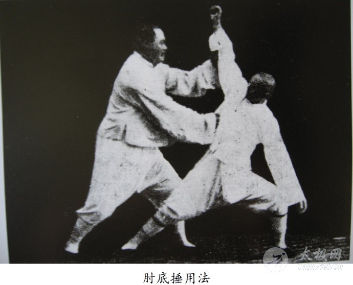 十一、 肘底捶实战用法(口诀:肘底看捶护中手) 1、杨澄甫: 甲按手式立,如乙拳法心诡计多,自甲左后方用右拳一打速往回就退,甲速向左方转身进步,左手自乙拳上绕下伸进托乙的肘尖,随用右拳打乙右肋,乙速退,甲速进三步才可打上。真用少易,不可泥影。 2、杨振铭: 由抱虎归山揽雀尾式,设敌人以右脚在前,自我左后方用右拳直击我之背侧,我急转右脚尖,左足上前踏出半步,弓腿坐实,随同转身,以左手用横劲掤住敌人右肘内侧,如敌人用左拳横击我之耳部,我急横上右脚半步弓腿坐实,同时用右手掤住敌人左肘内侧,如敌人抽右拳自上往下击我头部,我急将左手在敌人右肘下向上托起握住,随上左脚一步,右手急握拳向敌人胸部击去。 如敌人向后退右脚一步,将右拳落下崩我右拳,我急上右脚一步,左手随落下握住敌右腕向左牵住,急用右肩向敌人胸部靠去,如敌人念胸用左拳横击我之右肋,我即转正落右肘崩开敌左拳,并用右拳直击敌人乳部,此连续之变化也。 3、杨澄甫: 根据《太极拳体用全书》所述,此式用法有以下内容: (1)对方从身后击来,我转身用左手腕接对方的右手腕向右推开,以右手与对方的左手相接,得机得势时,左手指下垂,沿对方腕间转一小圈托起对方右腕,右手在左肘下用拳背向对方的中部横击。 (2)此式为太极五捶之一,所击的部位是人的危险部位,慎用。 (3)此式两手随腰运转时意念在掌,左手劲点与掤手同,右手劲点在腕部大拇指一侧。上托时,左手劲点在虎口,右手劲点在拳背。 4、杨振铎: 设对方以左拳自我左后向我背侧击来,我急以腰带动四肢由右向左转体,用左手逐渐变掌,掌心侧向外平行接近对方腕部,然后以横劲采的手法,随体之转动而握住对方之手腕,顺对方向前冲之势再向前带他,使彼失去重心,我即引其向内环一小弧,缓冲其力,再由下往上带,反扭对方左臂,使其左臂为我所控,当对方空出左侧腋部,我可以右拳击之。 5、牛春明: 该式是连环三手,比如我先以右手击对方太阳穴,若对方以左手由外迎隔,我便拗回右手,藏于左肘下,但左掌随即向对方面部击出。若对方又迎隔我左掌,则我右拳由左肘下出击对方胸部,此三手必有一中。 6、郑曼青传授 黄性贤: 此势用法有三: 用法(1)如对方用右手击来,我则用左手腕来接其右腕,向右推开,同时将左手指下垂,勾其腕部,如其用在左手来解,我则右手向左往下沾沉之,对方两手被我封住时,左掌扑其面部或叉其喉部,右拳同时击其胸口。 用法(2)对方右手击来,我左手执其右肘,向前引领,再转左腕,向上托去,同时用右拳击其胸口或肋部。 用法(3)对方左手横击我右太阳穴,我则用左手抓住来手,右手速击其左太阳穴,如其左臂上抬,我则用右手小臂压其臂,而用左手变拳击其下颔。 7、崔毅士传授 崔仲三: 对方用右拳向我头部进击,我急以右掌拦截,握其腕部,趁对方下落回抽时,以右臂的拧扣抑制对方,同时用左掌的穿撑进击对方面部。 8、董英杰传授 董虎岭: 接上抱虎归山式。对方从后击我左胸部,我速往左转身走两步面向对方,同时左手从对方捶上绕下托其肘上节,使其打空。 左脚往前迈步,右手握拳,击对方腰部,用内劲。 9、傅钟文: 偏着:在我肘底锤时,如对方用右手向我右面斜按我左手,我即乘势撤右步,用右手采对方右腕。 十二、 倒撵猴实战用法(口诀:退行三把倒转肱 坠身退走扳挽劲) 1、杨澄甫: 甲立,如乙用换拳法,左右拳先后直打,如右拳以直打来,右足进一步,随后左拳打来,左足进步,此为拉钻锤进步法,甲用倒撵猴破法,退左步左手搂乙的右拳,退右步右手搂乙的左拳,往后如法速退几步,甲如用换式亦可,左手搂乙右拳时,甲进右拳换打乙胸,甲右手还击可将乙打退。 2、杨振铭: 由肘底捶式,设敌人以右腿在前,用右手紧握我之左手腕或小臂,又用左手托住我之肘底捶,我右手急翻掌向上化一小圈竖起,随向后退左脚一步,并翻仰左掌向上,松肩坠肘,含胸向左后缩回置于腰间,但腰胯亦必松,屈膝坐于左腿,右脚变虚,则敌之握力顿失,同时我之右手向敌人胸部按去。 此式乃受制于敌人,败中取胜之用法也,左右倒撵猴之用意相同,而身法步法亦同。设敌人在我变左侄撵猴时,用左拳击我右肋我急用右肘由上往下崩开,随抬起右手用手背向敌人右面部挒去,此变法也。 3、杨振基: (1)《太极拳体用全书》述此式用法是:“设有敌人用右手紧握我手左腕,或小臂间,倘又以左手托住我肘底拳,则我先受其制,不得施展时,即翻仰左掌,用沉劲松腰胯向左后缩回。左脚也退后一步,屈膝坐实。右腿变虚,则敌之握力顿失。右手同时向后分开,至其失运气力时,急向前按去。” (2)此式是以退为进法,虽是后退,但后退时撵化去对方的劲,这在太极拳十三法中占一个“退”字。杨式太极拳的退,不是单纯的退避,而是退中有进,走中有粘,化中有发。 (3)此式的奥妙在于发沉劲。发沉劲时,要松腰胯,气沉丹田,使劲由脚而腿而腰达于手,则对方受制,不得不失去握力。不能单向后直拉手,直拉是两力相持,难以走化。 (4)此式运转时意念在手,后拉手劲点在腕背部,推手劲点在全掌。 4、杨振铎: 设我之左手腕为对方紧握,同时对方又以左手托住我之右肘底,我已受其制,在原地很难施展动作,此时,需退步引对方深入,我以沉劲松其腰胯,翻左掌向上向左后撤臂退步,与此同时,在对方跟进的一刹那之间,我速翻右掌向对方左胸部按击,在此一退一进之际,如进军之突