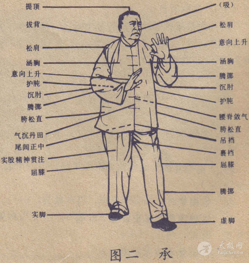 要练好太极拳,于理须明无极、太极的含义,于拳则须在理的指导下运动手足,经过长时间的锻炼方能成功。 太极者,无极而生,阴阳之母也。无极之义,无形无象,无声无臭、空空洞洞、混混沌沌,无一物而含万物。由无极而现有机,遂太极生焉。无极一动即是太极,太极成时必分阴阳,动静便是阴阳,阴阳便是太极。 若将太极之本义引伸开去则无处不在——广之堪比宇宙,狭者可喻人身,均无不恰如其分。古之学者将太极之形状虚拟为一硕大无朋的圆球,其内中阴阳旋转,互相调济以滋生万物,并将其形诸于图,这便是相传至今的太极图的由来。 若将无极、太极之理借喻人身,则人身亦为一小太极,这小太极中的阴阳代表即为心、肾。心属火在上为阳,肾属水在下为阴,通过太极拳的练习,使心火下降,肾水上升,心肾相交,水火既济,阴阳调和则百病不侵。 宇宙之中阴阳相生以至生生不息。阴阳互济又生三才。三才者天、地、人也。上天下地人居其间。将此三才之义借喻人体则有三身之谓。三身即精、气、神。精足、气满、神聚方为健康之相。精、气、神之舍为三丹田。上丹田为天门(百会穴),下丹田为地户(会阴穴),中丹田为气海。天门主神,地户藏精,气海蕴气。精、气、神乃生命之根,造化之源。当太极拳练到功形圆满时,凌神于天门则身轻如羽,凝神于地户则沉重如山,注神于气海则可得其中和之道。 练太极拳必先求无极。这是修炼太极内功的基础。拳诀云:“练拳先从无极始,阴阳开合认真求。”练拳之前站无极桩,可渐使自己心定神安,继而便可感觉到体内如同虚空无物地一般,两腿负载之感也随之尽消。待至虚至静时,复有一点灵犀生于气海之中,气动则太极生。要息气宁神地在若有若无、若实若虚、勿忘勿助中择其中和之道而行之,在无形之中渐渐感而遂通,则功力、灵气与日俱增。意念、感应灵通一气,渐臻妙境。综观练习无极站桩的益处如下:一能静养灵根,培植本元;二能养气养性,气满丹田实;三能内外严整,沉力重生,固若磐石;四能身心共静,周身虚灵,绷劲自然而生。 先站无极桩后练太极拳为“先求无极后成太极”。练习太极拳应注意以下几个问题: 1.练拳时尤要注重以心行气,以气运身,逐步达到炼精化气、炼气化神、炼神还虚、虚至虚灵的效果。若能细细体察其中奥秘,功必大进。 2.用劲要刚柔相济、阴阳参半。太极拳的用劲要符合太极拳刚柔相济的练功原则,既不能过于柔软,也不可偏于坚刚。柔软无力难以长功,坚刚过度则难养气血。故此必须循阴阳中和、刚柔参半之路径习练方可得“太极劲”。 3.不可用拙力。周身肌肉紧张,对于用力部位和着力点不加选择的盲目用力为“拙力”。练太极拳绝不可用拙力。若用拙力,则周身血脉不能通顺,筋骨不能舒畅,以致全身拘谨,四肢不活。身为拙气所滞,滞于何处绝密件何处成病,当时不觉,必于后发。在推手中若用出力,必为能手所乘,以致倾跌。若双方均用拙力,必发生顶抗的毛病,不能体现太极拳沾、连、粘、随之特点。 4.练拳亦不可努,努则力刚易折,且气易阻隔于胸,肺被排挤,久之必得胸憋肺炸之病。 5.练拳不可挺胸、收腹、突臀。否则气逆行而上,不能归丹田。气血上冲则双足似萍草无根,心肾不交,水火不济,阴阳不和。久之会影响健康。 6.练拳不可心存打人之念,以示速成。否则必为神气所拘,好勇斗狠而失心和。更有每日苦下功夫练数十遍拳者,亦不知已变运动为劳动,变养中长为疲中伤,久之五劳七伤与身俱存,稍有病痛便齐发而至,是为大害!学者尤须牢记。若气顺力活,虚心实腹则道心自生,久久行之身健功增,瓜熟蒂落,水到而渠成。 7.练好太极拳,还要懂一点经络学。经络发源于腑脏,布于肢体。经络畅通则百病不生。概内气发于丹田(气海),贯于经络之中,通过旋腰转脊,缠绕运行与腰隙内肾的左右抽换,使内气流布周身而达于四梢,复归于丹田。太极阴阳之理结合经络学说,二者相辅相成,互为表里。明白了上述道理并付诸实践,才能在练拳时逐渐做到内外相合、上下相随,周身一家。以心行气,使气不离丹田(开时气行周身,合时出肾入肾、任督相交,浑灏流行,一气呵成。 [page] 【训练方法】 ①静心用意,呼吸自然,即练拳都要求思想安静集中,专心引导动作,呼吸平稳,深匀自然,不可勉强憋气; ②中正安舒,柔和缓慢,即身体保持舒松自然,不偏不倚,动作如行云流水,轻柔匀缓; ③动作弧形,圆活完整,即动作要呈弧形式螺旋形,转换圆活不滞,同时以腰作轴,上下相随,周身组成一个整体; ④连贯协调,虚实分明,即动作要连绵不断,衔接和顺,处处分清虚实,重心保持稳定; ⑤轻灵沉着,刚柔相济,即每一动作都要轻灵沉着,不浮不僵,外柔内刚,发劲要完整,富有弹性,不可使用拙力。 太极拳对人体各部位姿势的要求如下: 头──保持“虚领顶劲”,有上悬意念,不可歪斜摇摆,眼要自然平视,嘴要轻闭,舌抵上颚; 颈──自然竖直,转动灵活,不可紧张; 肩──平正松沉,不可上耸、前扣或后张; 肘──自然弯曲沉坠,防止僵直或上扬; 腕──下沉“塌腕”,劲力贯注,不可松软; 胸──舒松微含,不可外挺或故意内缩; 背──舒展伸拔,称为“拔背”,不可弓驼; 腰──向下松沉,旋转灵活,不可前弓或后挺; 脊──中正竖直,保持身型端正自然; 臀──向内微敛,不可外突,称为“溜臀”、“敛臀”; 胯──松正含缩,使劲力贯注下肢,不