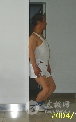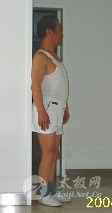 1. 两脚站立的位置:我们讲拳的方位仍用中国人习惯的东西南北来表述,根据需要有时也用角度来表述。在地上南北方向画一条直线;你面向南,左脚踩在这条直线上,既然是踩,就一定要踩正了。右脚成45°贴在左脚的后边,右脚脚跟的圆弧正好与这根线在左脚后边相切。 我说的是脚,若穿着鞋,鞋底比脚大出一圈,则右脚脚后跟的鞋底要踩过一点线。 2.身体的状态:两脚按规矩站好位置后,把身体站直,站舒服了,这时头向南,胸向西南,身体要挺拔,就是要立如松。按前边武术试验“含胸拨背”、“肩胯相合”的要求,这种站立姿式你应该已经形成习惯了。 3.头的状态:头要尽力向上顶,下颏要往里收着点,两眼平视,注视前方,使自己有一种像牛犊一样、梗着脖子盯着正前方的感觉。按前边武术试验“虚领顶劲”的要求,你也应该形成习惯了。