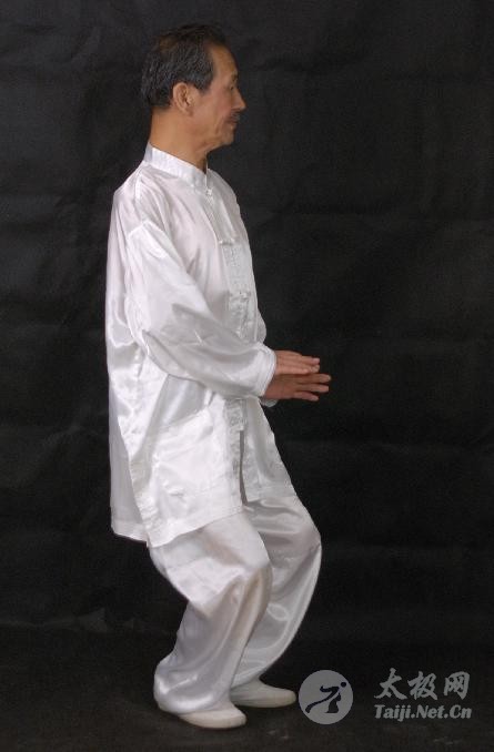 先站好三体式的标准站立 两手贴着身子向肚脐方向提起、两腿同样用力逐渐弯曲,使身体垂直向下蹲,两膝弯曲的方向要与脚尖的方向一致,下蹲到标准高度(参见《需要统一的概念(正前方下蹲高度)》 编者注)手的动作与下蹲同时完成。