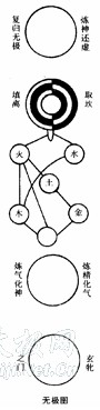 太极图式 太极图式大致分为两种,一是层迭式太极图,二是双鱼式太极图,现分别加以介绍。 (一) 层迭式太极图 层迭式太极图有多种模式,现只介绍陈抟的《无极图》和周敦颐的《太极图》。 无极图(如左图),传说这就是陈抟所传三图之一。宋·朱熹说:“先天图传之希夷,希夷又自有所传,盖方士技术用于修炼,《参同契》所言是也”(《语类》)。《周易参同契》是早期道家炼丹理论之一,其书说:“大易性情,各如其度;黄老用究,较为可御;炉火之事,真有所据;三道内一,俱出径路。”可见,它是融《周易》理论、黄老学说、炼丹实践为一体的著作。 清·黄宗炎《图书辨惑》说,此图式最下一圆圈为“玄牝之门”,指人身两肾间空虚之处,即祖气(丹田之气)所出之处。往上第二个圆圈“炼精化气,炼气化神”,对上升的袓气加以提炼,化精气而为呼吸之气,化呼吸之气而为精神。第三圈表示所炼之气藏于五脏之中,统帅水、火、木、金、土五气,炼到火气下降,水气上升,火不燥热,水不卑湿,温养之至,则进入第四圈。第四圈“取坎填离”,水火相交,形成圣胎,这就是中央的那个白圈。此圣胎再加以修炼,则就到了最上层“炼神还虚,复归无极”,达到了虚无飘渺的神仙境界。最下和最上一圈皆为“虚无”,中间为“有”,表示从“无”到“有”,又反归于“无”,故称“无极图”。 易界有人不愿说此图与炼丹有关,可这是事实。陈抟是宋代得道高人,他得到道家秘传是不足为怪的。道家是在吸收了《易》的智慧的基础上发展起来的,炼丹是道事之一。中国的炼丹术在世界上是最早的,它对后来的冶金乃至化学都有重大贡献。 周氏太极图 北宋·周敦颐对上面的“无极图”进行了发展,改造成了“太极图”,并著有《太极图说》。“周氏太极图”有古、今两种图式,今本图式是经朱熹修改过的,流传较广,现将两图录于下: 周敦颐所著《太极图说》,是为太极图写的说明,全文只有249字,《宋史》在周敦颐传内收录,全文如下: 无极而太极。太极动而生阳,动极而静,静而生阴,静极复动。一动一静,互为其根;分阴分阳而两仪立焉。阳变阴合而生水、火、木、金、土,五气顺布,四时行焉。五行一阴阳也,阴阳一太极也,太极本无极也。五行之生也,各一其性。无极之真,二五之精,妙合而凝。乾道成男,坤道成女。二气交感,万物化生,万物生生而变化无穷焉,唯人也得其秀而为灵。形既生矣,神发知矣,五性感动而善恶分,万事出矣,圣人定之以中正仁义,而主静,立人极焉,故圣人与天地合其德,日月合其明,四时合其序,鬼神合其吉凶。君子修之吉,小人悖之凶,故曰立天之道曰阳与阴,立地之道曰柔与刚,立人之道曰仁与义。又曰原始反终,故知生死之说,大哉,《易》也,斯其至矣! 此说是将无极、太极、阴阳、五行以及《易》理结合在一起,来说明宇宙万物的形成过程。图是从上往下看的,最上一个圆圈是太极,太极是宇宙的本源,是寂静不动的。由太极而生阴生阳,,阳动而阴静,阴阳二气合抱、交感而生出五行之气。阴阳五行的精华凝聚在五行图的最下一圆圈内。这种天地之精华便是乾和坤,“乾道成男,坤道成女”,阴阳交感而有万物;在这宇宙中,唯有人才是万物之“灵”。接下来说的就是“人道”了。可见,此图虽说与《无极图》相仿,但却摒弃了“炼丹”之说,而是从宇宙本源上来论太极图。 (二) 双鱼式太极图 双鱼式太极图就是黑白(阴阳)互纠的图形,这是易图中的主要图式。这类图式很多,现只将 先天太极图、来氏太极图和今太极图简要介绍如下。 先天太极图 又称《天地自然图》、《天地自然河图》,相传是陈抟传出的三图之一,一说是来自西蜀隐士(见下图)。此图最早载于明·赵谦扐的《六书本义》,他说:“此图世传蔡元定得于蜀隐士,秘而不传,虽朱子亦莫见之,今得之于陈伯敷氏,当熟玩之,有太极函阴阳,阴阳函八卦自然之妙,实万世文字之本源,造化之枢纽也,呜呼,神哉!” 清·胡谓在《易图明辨》解释说: 其环中为太极,两边黑白回互,白为阳,黑为阴。阴盛于北,而阳起而薄之。《震》东北,白一分,黑二分,是为一奇二偶;《兑》东南,白二分,黑一分,是为二奇一偶;《乾》正南全白,是为三奇纯阳;《离》正东,取西之白中黑点,为二奇含一偶,故云“对过阴在中”也。阳盛于南,而阴来迎之。《巽》西南,黑一分,白二分,是为一偶二奇;《艮》西北,黑二分,白一分,是为二偶一奇;《坤》正北全黑,是为三偶纯阴;《坎》正西,再取东之黑中白点,为二偶含一奇,故云“对过阳在中”也。《坎》、《离》为日月,升降于《乾》、《坤》之间,而无定位,故东西交易,与六卦异也。 此论甚明!这个太极图,其白为阳,其黑为阴,阴阳相合,互纠不分。黑白点表示阴中有阳、阳中有阴。巧妙地配以“先天八卦”,清楚地看出阴阳消长的过程,深得阴阳造化自然之妙! 此图揭示了天地变化的规律,蕴含着深刻的哲理,后世的众多太极图均采用此种图式,也没有脱离此图的内函。 来氏太极图 明代易学家来知德根据先天太极图,经“研索而成”来氏太极图,见左图。他说:“此圣人作易之原也,理气数象,阴阳老少,往来进退,常变吉凶,皆寓于其中。” 此图白者为阳仪,黑者为阴仪,表明阴极生阳,阳极生阴。以居中的黑白两线代表原古太极图中的黑白点。中有一阳圈,以象太极,有“无极而太极,太极而两仪”之妙。来氏作《美圆歌》说:“我有