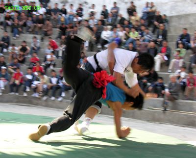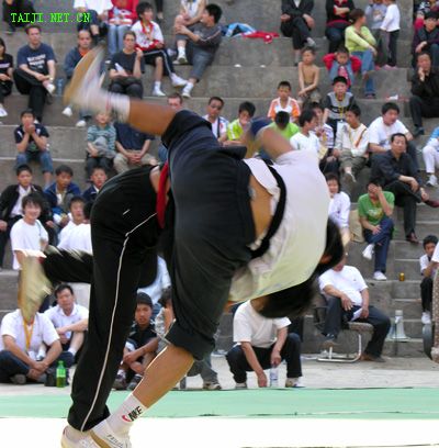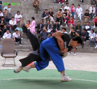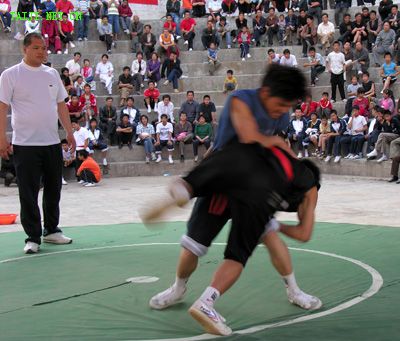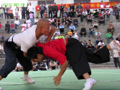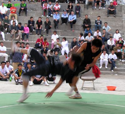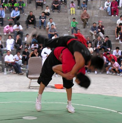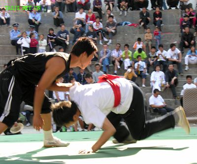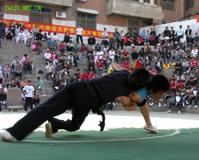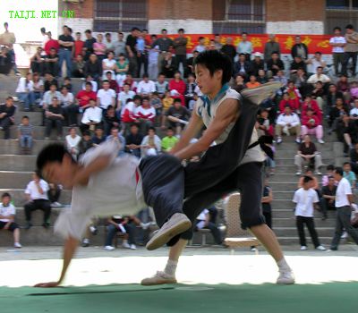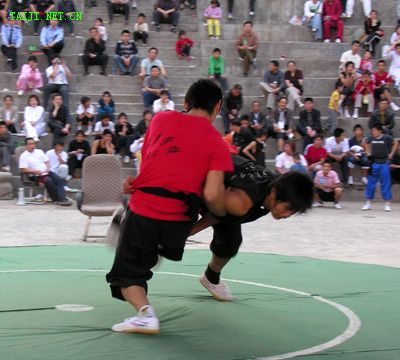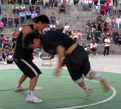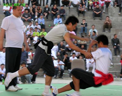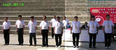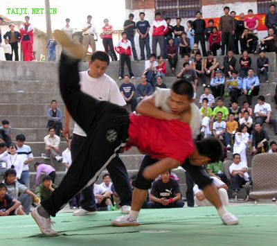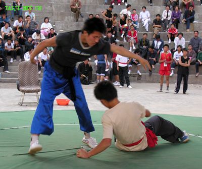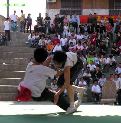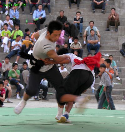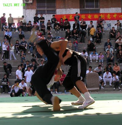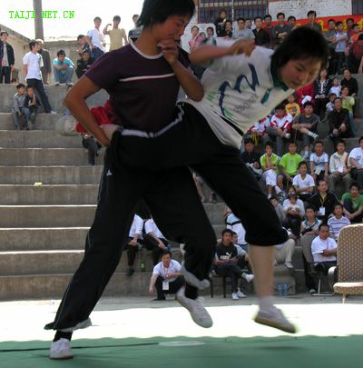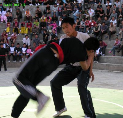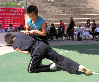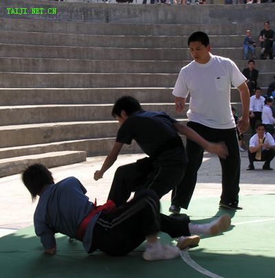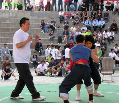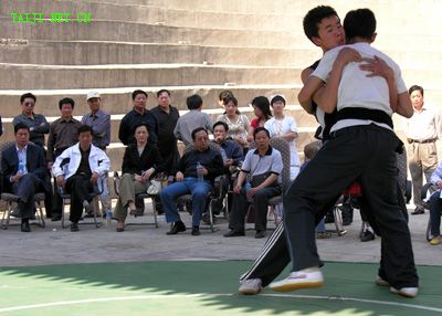 今天下午,2006年陈家沟太极推手擂台赛在温县灯光球场拉开帷幕。温县有刚武校的张祎祎、沁阳雷龙武校张丹分别在女子55kg的比赛中第一轮胜出;男子第一轮胜出者为:48kg陈家沟武术院许毛毛、白杨伟、有刚武校李恒、焦作华盛武院杜登生;52kg有刚武校李斌斌、陈家沟太极拳辅导站董广杰;56kg温县振中武校董攀、李腾飞、温县太极拳武校米纪元、陈家沟武术院王巍、庆州武院王建业、沁阳雷龙武校宗磊磊;60kg陈家沟太极拳学校张彦飞、有刚武校邰乾坤、太极武术馆严华寅;65kg太极武术馆王亮、庆州武院郭杰、振中武校王武强;70kg河南博爱太极拳协会司剑平、陈家沟武术院赵麒麟。他们将在明天进入第二轮淘汰赛。陈家沟当代太极名师陈有则、王战军、陈冲、陈志强、陈大虎等将在比赛中担任裁判,他们均为国家一级裁判。