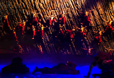 此外,《风中少林》的另一亮点是其舞台背景。剧中质感强烈的岩石、巨大的佛像、可移动的塔林和威严的石狮,无不体现着少林文化的厚重,三道横吊在舞台上空的牌楼更蕴涵着多层象征意义。最给人震撼的是舞台后方横贯全台的巨大岩石,配合现代舞台手段和灯光,在少林武僧出场时,构成一排排石雕般的武僧群像,继而在山动地摇的吼声中一展飞檐走壁的绝技,无不丰富了舞台的表现力。