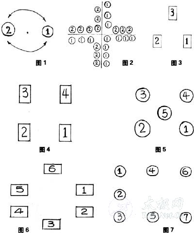 左右两脚分立(1)、(2)位,左脚向前进至(4)位,同时右脚即跟至(6)位,左脚转身(7)位,右脚进(4)位,左脚跟进(5)位,右脚斜进(2)位,左脚再进至(3)位,右脚斜退至(5)位,左脚身进(4)位,右脚斜退至(2)位,左脚顺退至(1)位,恢复原式。重复交换动作,越快越好(图7)。