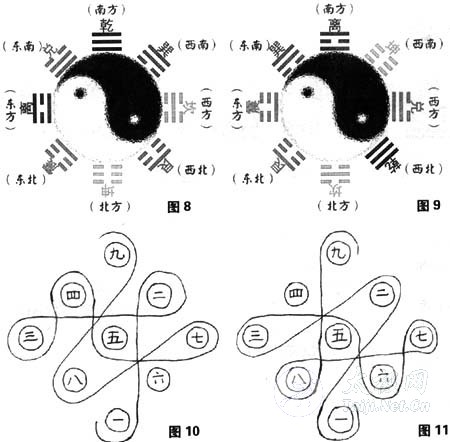 [page] 练习八卦步者,首先要懂得八卦之原理的八卦图和方位排列(图8、9),同时要将基本姿势站好。站立时(按左转)左足在前,右足在后,两足尖向前略向右偏,前足尖与后足跟贴在圆圈线上,并与肩宽,身体重力按三七开分配在前后腿上。左手抬起中指稍与眉齐,眼从虎口向外看,胳膊成半月芽状,掩肘,使肘关节窝向上(要放一鸡蛋不掉),右手跟在左手肘下,手的形状与前手相同,食指指向肘尖,相距1一2寸,同时掩肘,然后向左转腰,至前手对圆心。 走步时假设敌方在圆心,我在圆周上绕敌走转,一旦得机得势即向敌方进攻,也就是向圆心换掌出击,至对侧圆周正好完成换掌动作,然后变换方向绕圆进行。练习时要求头向上顶,微收下颚,闭口合牙,舌尖轻顶上颚,自然呼吸,两肩放松向下垂,保持相平,两肘有下堕之意;背要绷紧,前胸要空,腹部要实,气沉丹田,手腕立起,手掌外顶;臀部要溜,肛门要提,不可鼓臀,两膝向里合,有掩裆之势;外观身体周正,不俯不仰,不歪不斜,充满内劲,全身形成整体。走转时,起脚要平起,落脚要平落,步行如趟泥,全身不滞不散,不迟不断,腰似车轴,气如行云。 八卦步的特点主要是以绕圆走转为运动形式;其足迹呈圆形,正好是八卦图中八个方位的连线。“绕圆走转”是通过摆扣步实现的。两脚向同一方向连续交替以摆步和扣步行进,就能形成沿圆走圈;两脚改变摆步和扣步的方向,就能改变身体运动的方向。摆扣步幅度的大小,制约着走圈的大小和方向变转角度的多少。走圈时,摆扣步幅度越大,圆圈越小。变转运动方向时,摆步和扣步幅度越大,变转的角度越大。“步若趟泥”,指两脚似在泥水中趟行那样,脚掌平平提起、平平移动、平平落地地交替运动。运动中不能有掀起脚跟或翘起脚掌状态,而且在移动过程中,脚掌在贴近地面约一寸而不能触地。 九宫步具有较高的技击价值。练习时,练习者将九个标志物视为九个敌人,通过在宫中快速穿绕换势而不触及标志物,提高闪躲敌人、进退自如的灵活性。并有助于训练脚的撤扣变转,提高手眼步身法协调配合的能力。由于分置九宫的标志物形成的空间障碍限制肢体在空间的活动范围,从而加大了躯干翻转拧旋的幅度,提高了健身的锻炼效果。 一般采用长于练习者身高的竹竿或木棍,下端插入铁木制的底座制成标志物。如没有竿、棍,可在九宫位置上分布砖石或画小圈代替,不过其锻炼效果不如穿绕竿、棍。如在树林中练习,亦可通过随意穿绕树林株进行飞走九宫的锻炼。 初习九宫步时,株行距应宽一些,一般各为五尺。逐渐减少,直至仅容身体拧转穿绕其间。 九宫步的穿绕顺序,采用传说中的“太一行九宫之法”。顺序序描绘为“二四为肩,六八为足,左三右七,戴九履一,五居中央”。即“始坎、次坤、次震、次巽,复息子中宫,自中宫至乾、次兑、次艮、次离,一周毕矣”。此顺序称为“顺穿”(图10)。由离宫(宫九)返回坎宫(宫一),为“逆穿”(图11)。 初练九宫步,以八卦步顺序绕走,步法熟练后,可任意选取八卦掌中的掌法作为穿绕中的变换拳式,并始终把边走边穿,一穿即换,眼随手走,手随步开,腰随步活作为手眼身法步协调配合的原则。 其他拳种的练习者,借鉴九宫步练法,将所习拳种中的拳式结合于急骤退、左交右躲的矮步窜走步法中,循“戴九履一图”的顺序穿绕,也可获得锻炼效果。