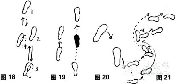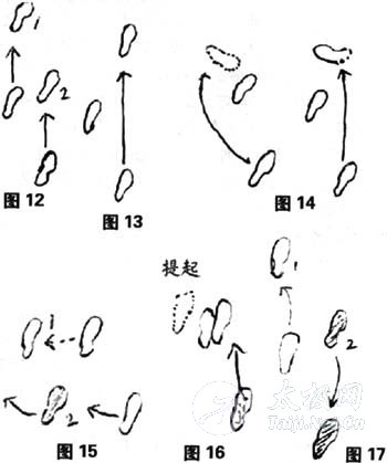 十全组合步是将技击中常见的步法灵活、交替地综合起来进行练习的一种重要步法。它是由十种步法所组成。 1、进退滑跟步:前脚向前上半步,后脚向前滑跟半步(图12),退步后脚先向后退半步,前脚滑跟向后半步。 2、左右交换步:后脚向前跳跃一步,左势变右势,前脚再向后回跳一步成原势(图13)。 3、前后插盖步:后脚向前脚后斜上一步,后脚跟离地,两脚略呈交叉,前脚顺势向前一步为插步,后插步顺来势退步。后脚向前上一步,脚尖外摆,两膝微屈,前脚顺势向前一步成技击式盖步,后盖步顺来势退步(图14)。 4、左右侧移步:前脚向左右侧移动半步,后脚随之向左右侧横移一步,同时身体向左右转动(图15)。 5、前后垫疾步:后脚蹬地向前脚跟垫进,前腿屈膝提起向前疾进半步。退步时前脚蹬地向后脚尖前垫退,后脚向后疾退半步(图16)。 6、前后齐跃步:两脚同时快速向前齐跃一步着地,退步同时向后齐跃(图17)。 7、快慢浪跳步:两脚前后左右,不分方位地做快慢连续不停的齐跃或前后左右交错移动跳步及前进后退,呼吸要均匀自在,快慢交替进行(图18)。 8、提膝直膝步:前脚迅速抬膝而起,膝尖向左右方,支撑脚做快速前后移动步为提膝步;前脚迅速提膝,膝尖向前上方的,为直膝步(图19)。  9、左右转趾步:上体左转90度,左右两脚跟提起,以左、右脚掌为轴,脚跟由后经左向前转动180度,同时膝关节左转180度,弯曲大于90度(图20)。上体再向右转90度左右,如上反复,用臀部发力。 10、S形闪进步:用快速的各种上述步法向左,向右,再向左做S形前进后退步,动作要象闪电似快速凌厉的为闪进步(图21)。 以上十种常见步法为十全步,经常交错反复练习熟练,再加上一圆步至九宫步的综合练习,在实战技击中就能够攻守自如,轻灵自在,发挥巨大的作用。 还有,大家总提到太极拳的腿法,其实步法练得活了,虚腿就是腿法,当然同其他传统武术一样,太极拳的腿法也是暗腿。且每一步都是一腿 . 千斤腿功的松膝法