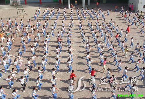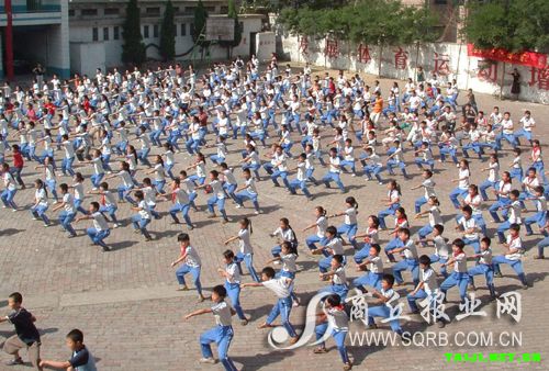 12日上午第二节课后,当其他学校的学生在操场上做广播体操的时候,商丘市金宝学校的师生们却在操场上打着自编的武术操。瞧,他们打得多带劲啊! 据该校党支部书记侯秀萍介绍,中华武术源远流长,学武术既能锻炼身体,又能让学生接受中国古文化的熏陶。“我们经过实验,发现小孩子对学武术非常感兴趣,就在这学期,全校各个班级都学习武术操。我们还在6月9日举行了中小学生武术操比赛。”金宝学校的武术操,是学校体育老师从传统套路中摘出的冲拳、弹踢、马步等加以组合而成的。